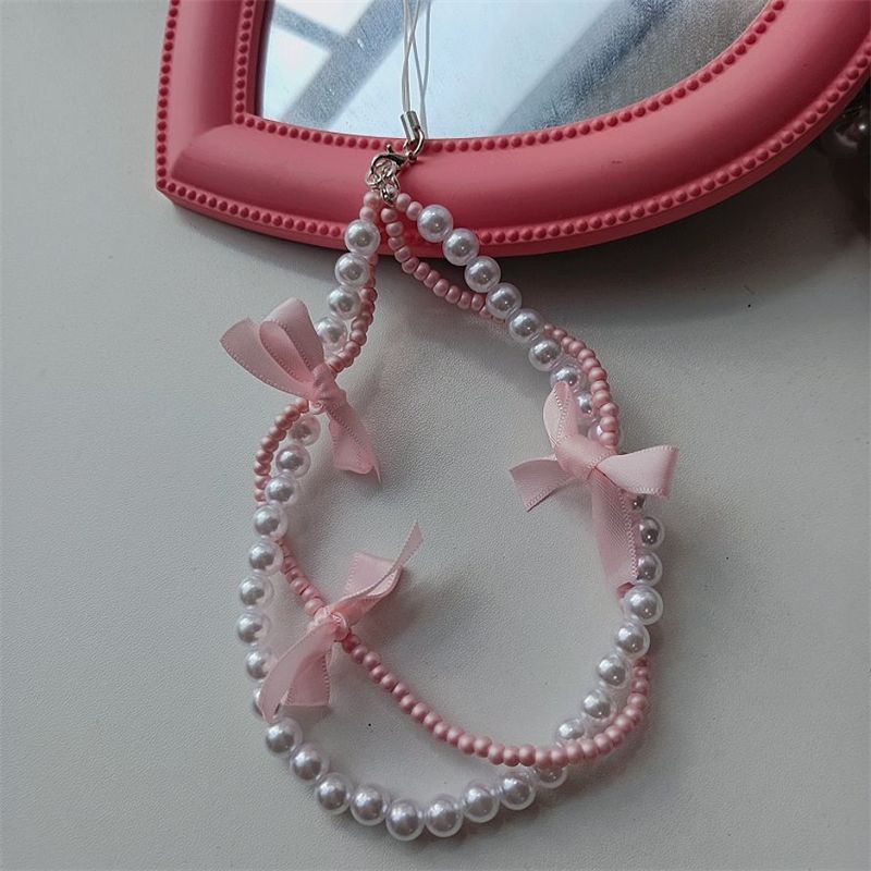 Korean Y2K Cute Pink Black Bow Beaded Phone Chain Charm Lanyard For iPhone Samsung Huawei Universal Accessories Jewelry Pendant