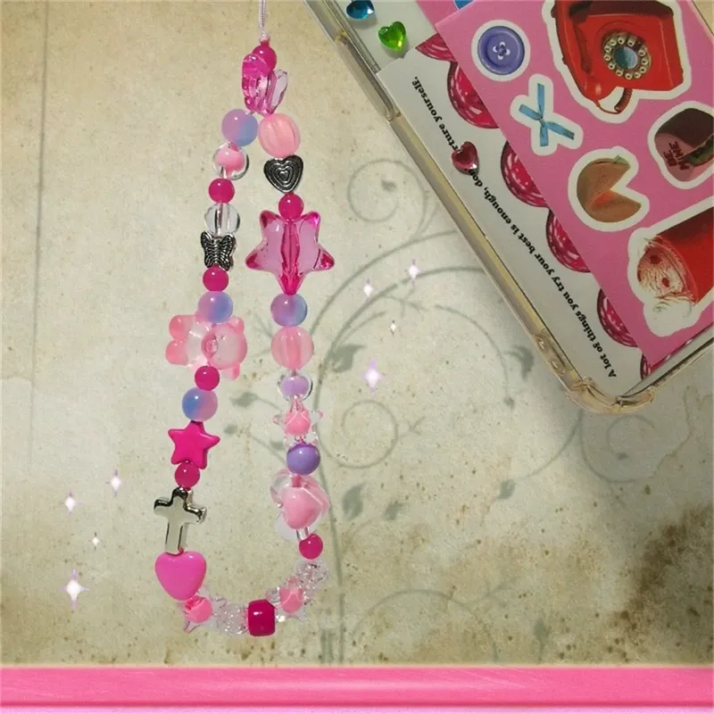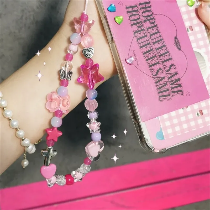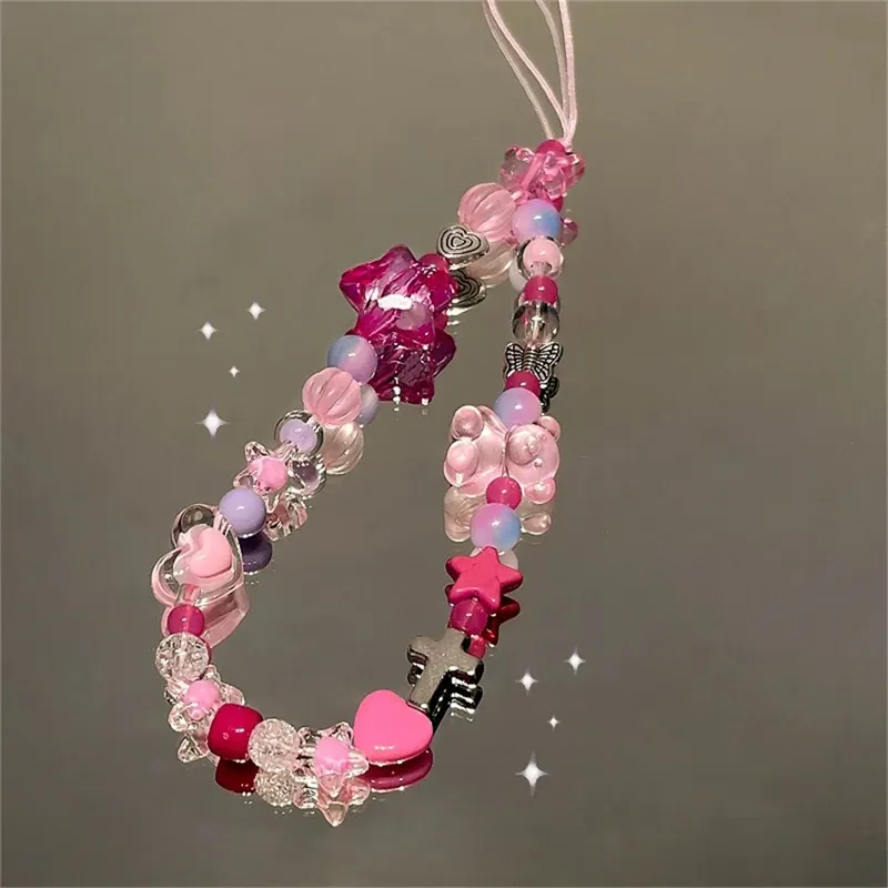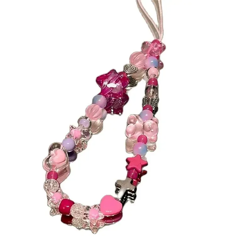 Korean Y2K Star Pink Bear Heart Beads Phone Cute Charm Chain Lanyard for IPhone 16 Samsung Accessories Hanging Rope Girl Jewelry