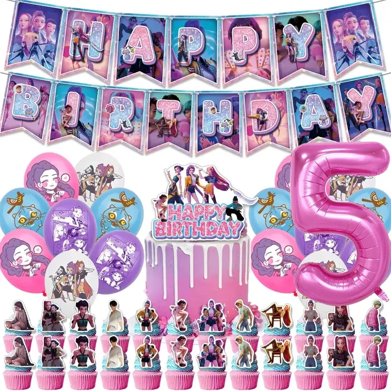 Kpop Demon Birthday Party Decoration Hunter Group Birthday Party Supplies Huntrix Kpop Anime Cake Topper Balloons Hanging Flag