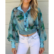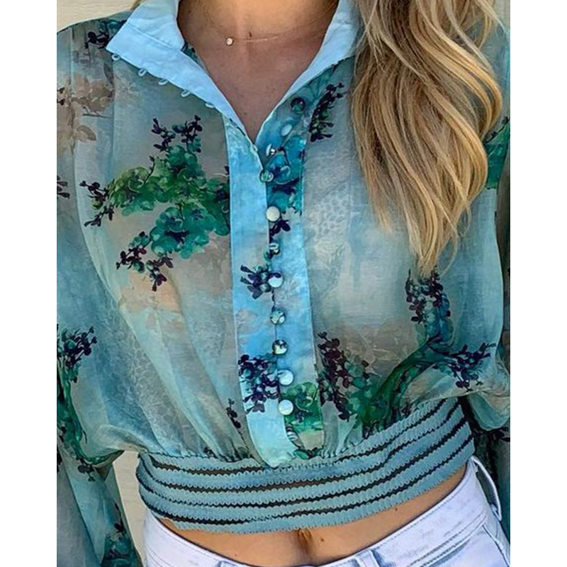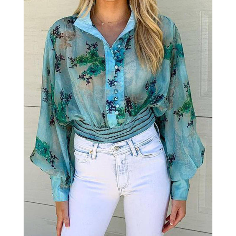 Ladies Casual Long Sleeve Printed Sheer Shirt Blue S