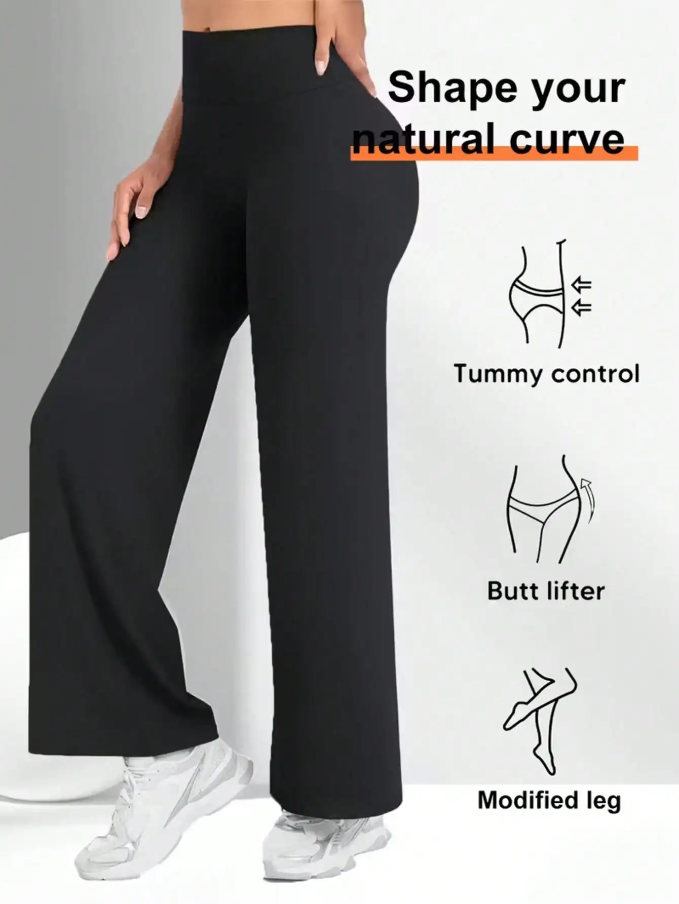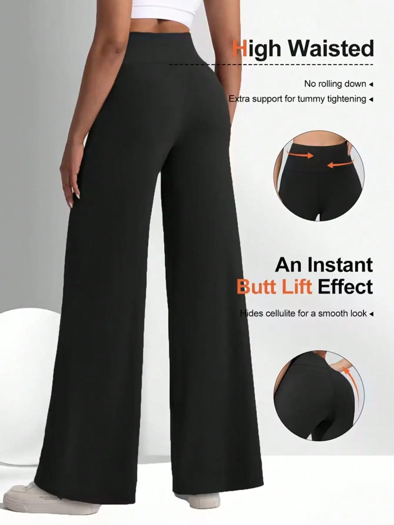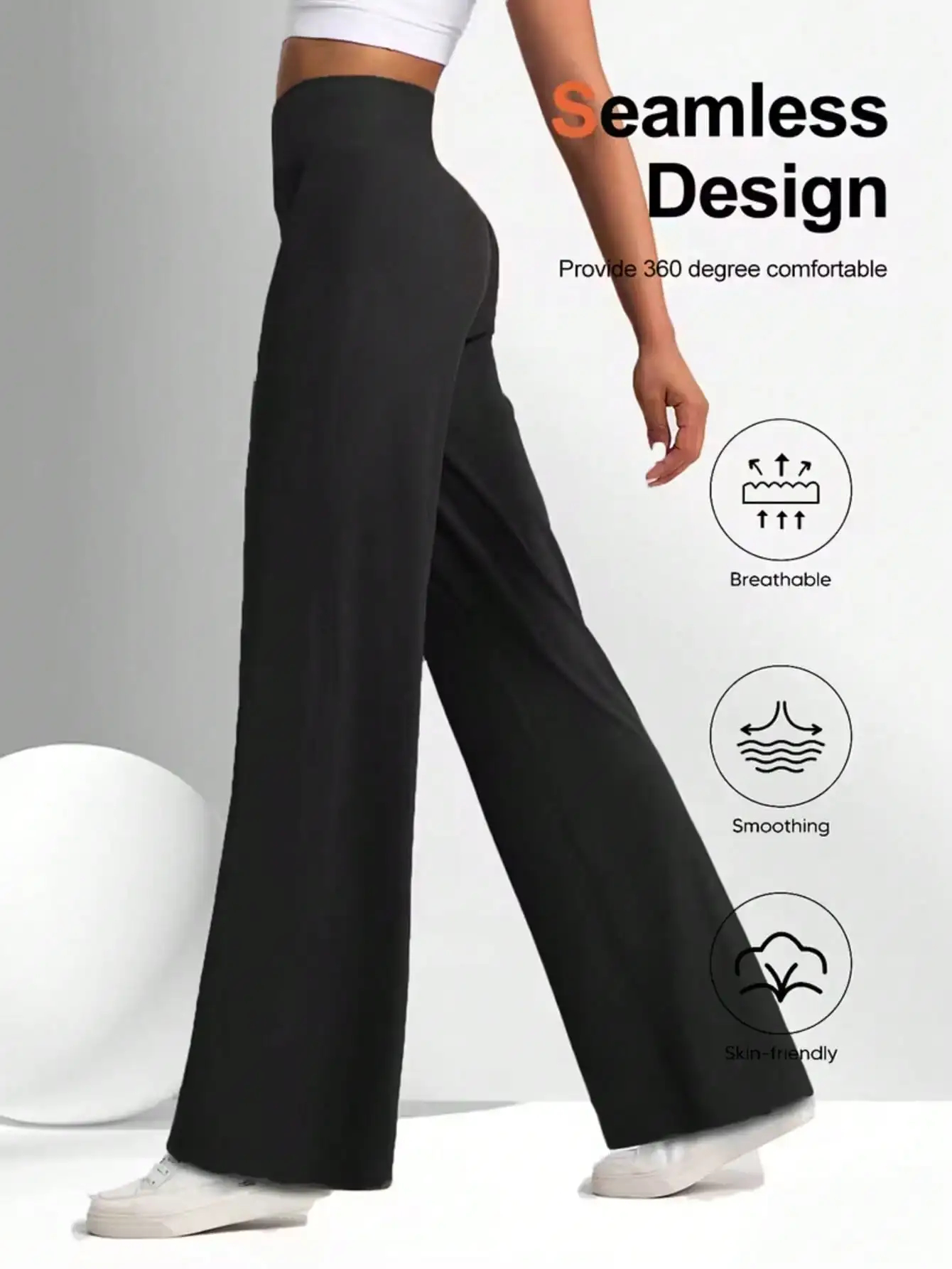 Ladies' high waisted elastic fabric elastic waistband solid color wide leg yoga pants pants, suitable for outdoor fitness