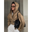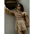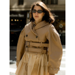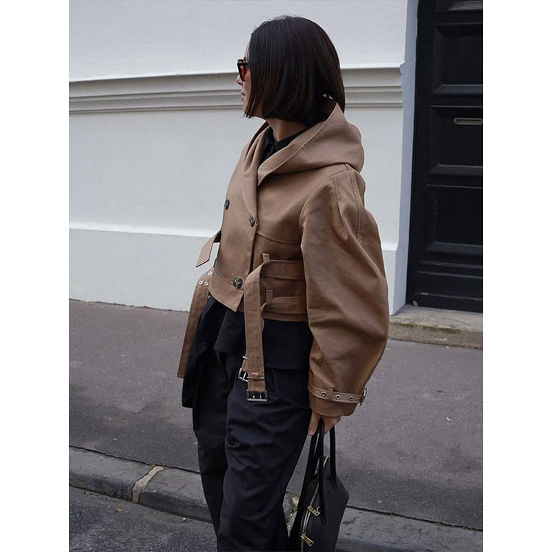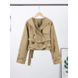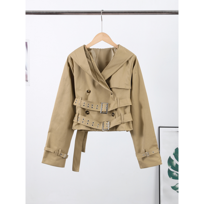 This beige cropped trench jacket features a double-breasted design and a wide lapel, combining classic trench elements with a modern, trendy silhouette. It’s perfect for adding a chic touch to your outfits. ��