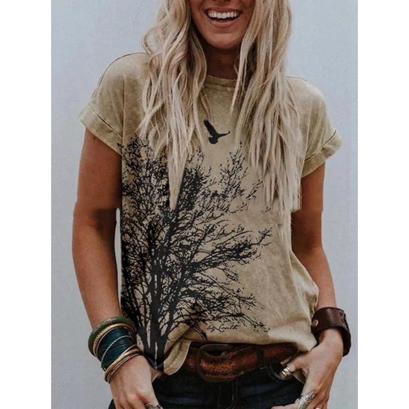 Landscape Print Round Neck Short Sleeve Ladies Casual T Shirt A 2XL
