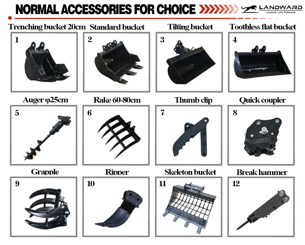 The advantages of LANDWARD mini excavator include but are not limited to its compactness, flexibility, simple operation, convenient transportation, high working efficiency, high cost-effectiveness, wide adaptability, etc., and the accessories can be quickly replaced to meet different work needs, further improving the utilization rate of the machine. These advantages make the mini excavator an ideal choice for many occasions such as urban construction, gardening work, orchard management, etc.