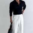 Lapel Button Long Sleeve Polo Shirt Slim Fashion Solid Striped Knitted Bottoming Shirt Top Men's Clothing White 2XL