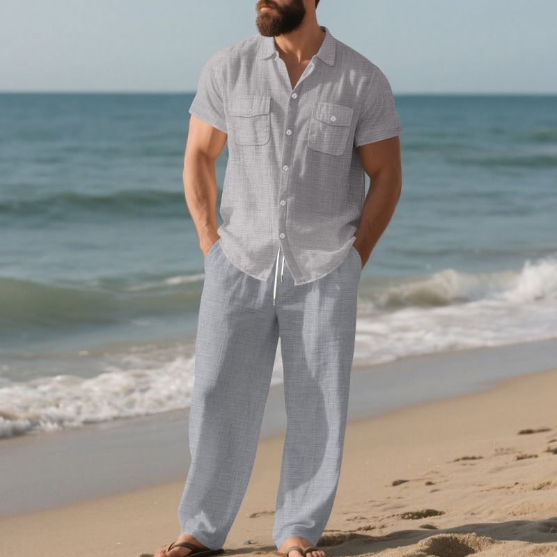 Lapel Shirt Short Sleeve Trousers Suit Men Gray XXL