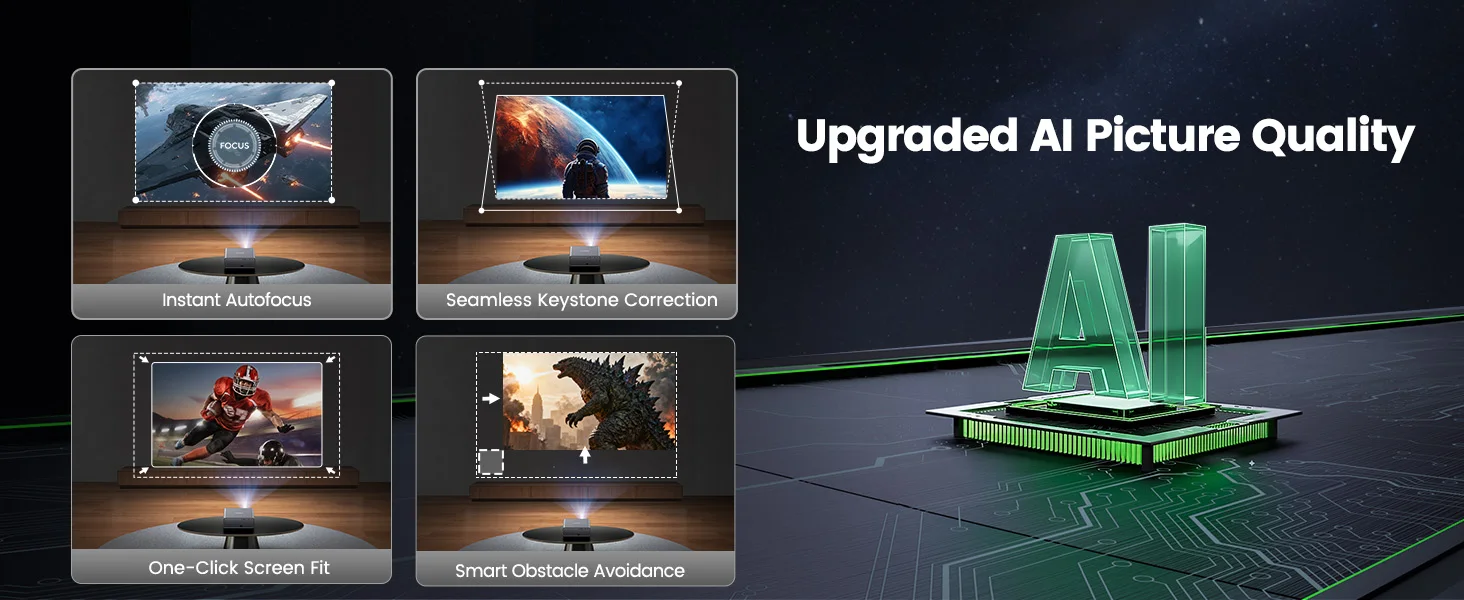 Auto focus projector functions, automatic keystone correction, intelligent obstacle avoidance, screen alignment and 50%-100% zoom allow you to get a clear image in the blink of an eye.