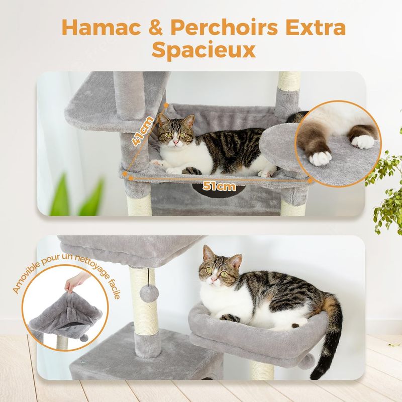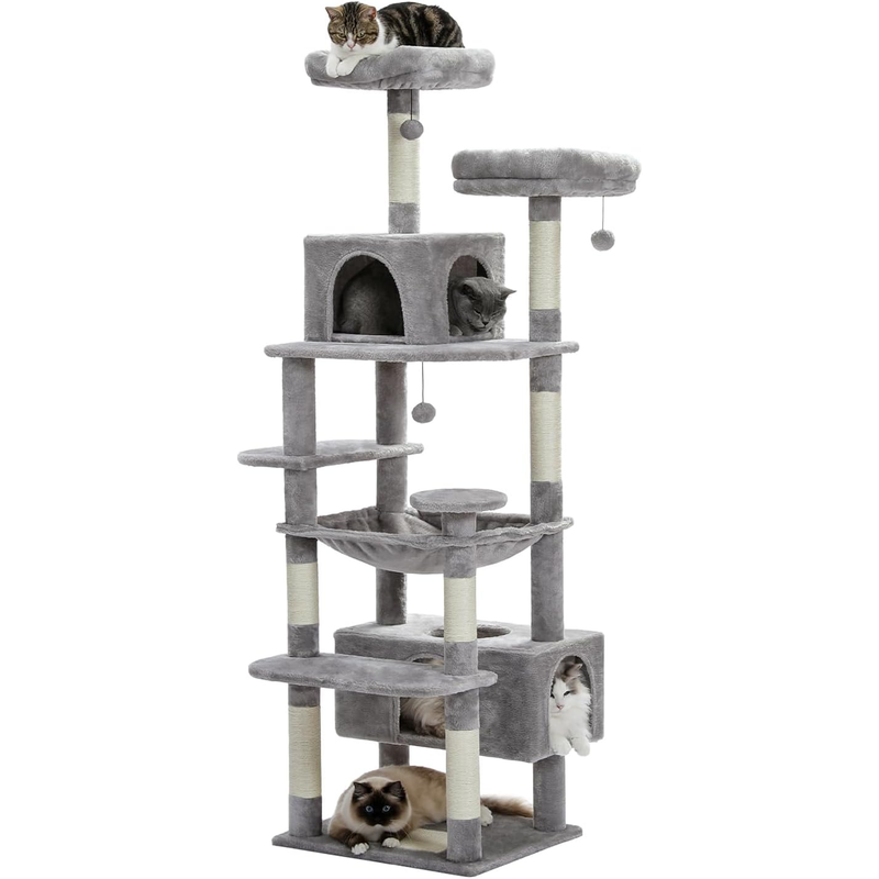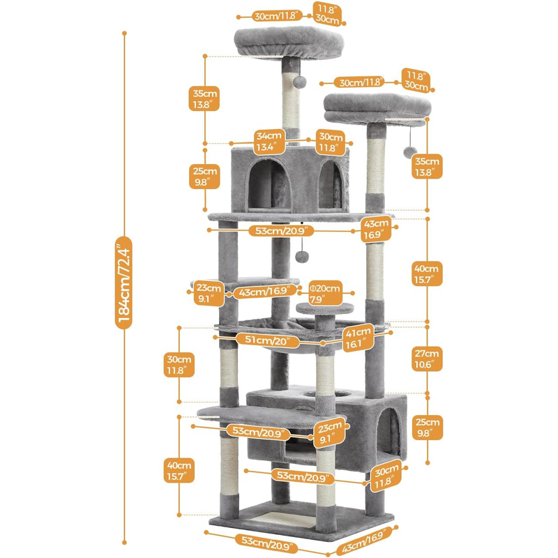 184cm Tall, Endless Climbing Fun: with the total height of 184cm in the 8 step structure, the super large cat tree is perfect for 4-5 big cats who like to climb up and down together. The needs of scratching, climbing, sleeping and training can also be fully satisfied. In particular, the unique rectangular, super large cat apartment and wide hammock are much larger than normal ones and perfect for cats resting together.