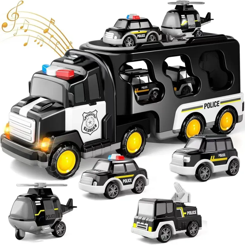 FRICTION POWER VEHICLE - No batteries needed. Just push the big truck forward, it will carry four small vehicles and set off! The head of the big carrier can also turn. Separate the cab and traction compartment, and then open the tailgate to transport the cars down. And push the small car backward, they can run forward by themselves. Easy to play toys for baby.