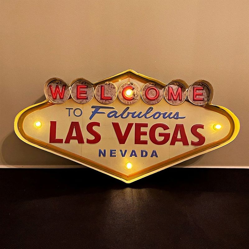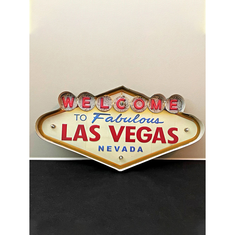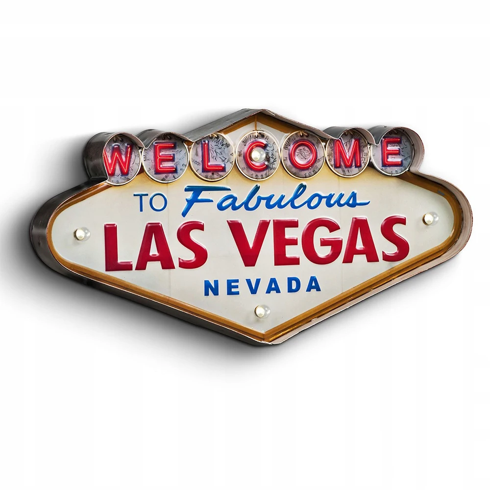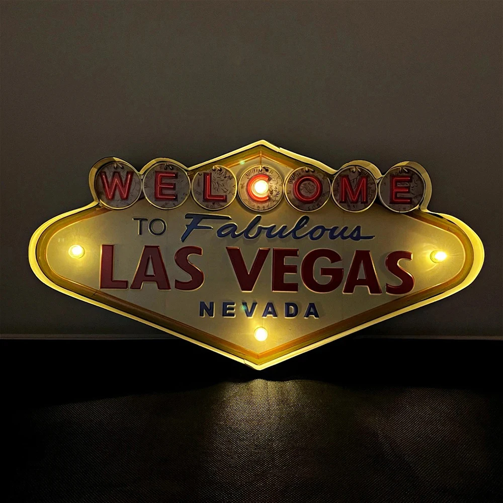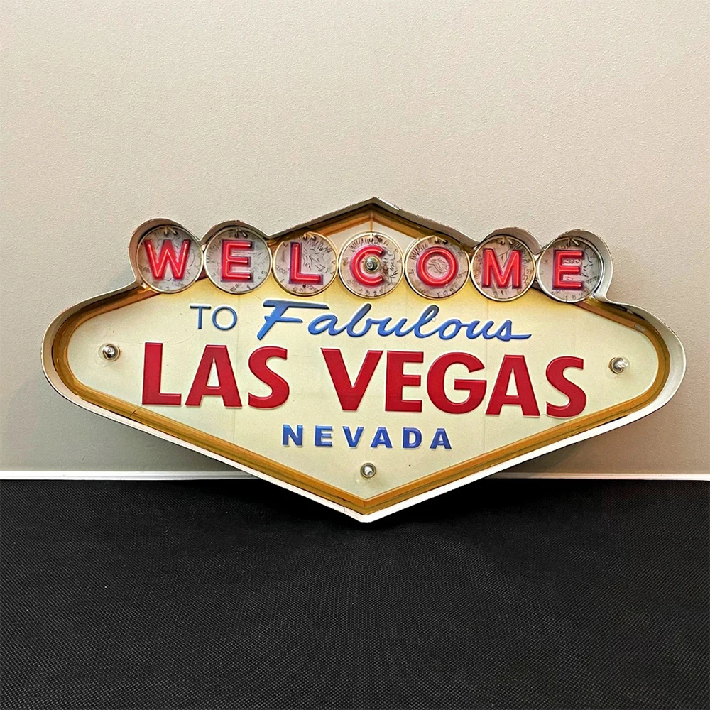 **Las Vegas Retro Light Sign** - Bring the vibrant energy of 1950s Las Vegas to your space! This vintage-style tin sign is perfect for adding a nostalgic touch to your **home, bar, cafe, restaurant, or office**. Made from durable tin with a retro design, this wall plaque features bold colors and a weathered finish, making it a unique decor piece.