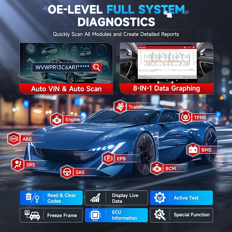 1. OE-Level All System Diagnosis: Access all the available systems and perform in-depth inspections for the whole car,for every electrical modules for detailed fault codes, live data, freeze frame, ECU information ,etc.