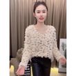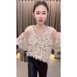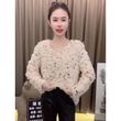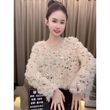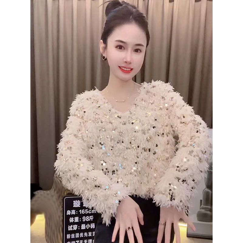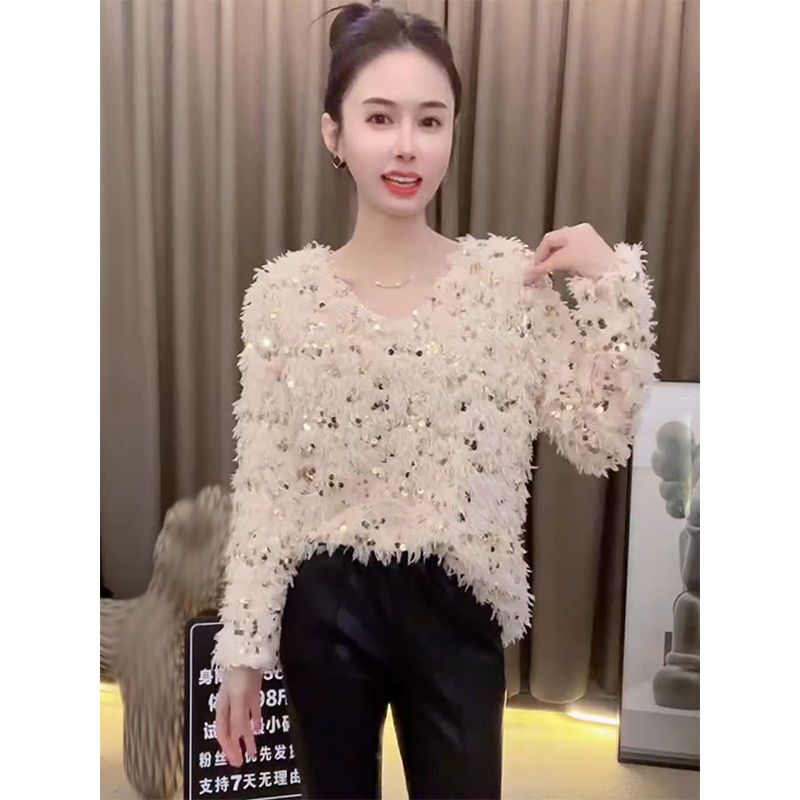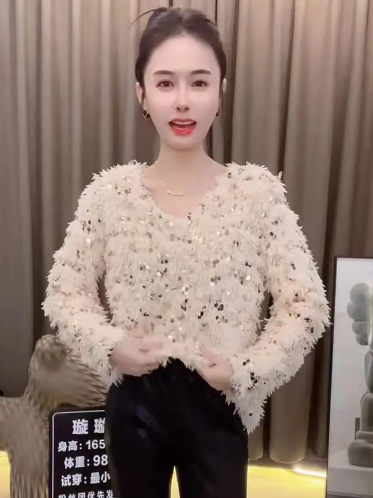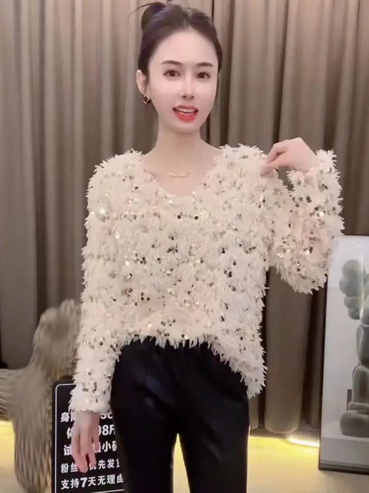 Lazy Style V-neck Long Sleeved Sequined Patchwork Women's 2024 Winter New Versatile Slimming and Slimming Western-style Top
