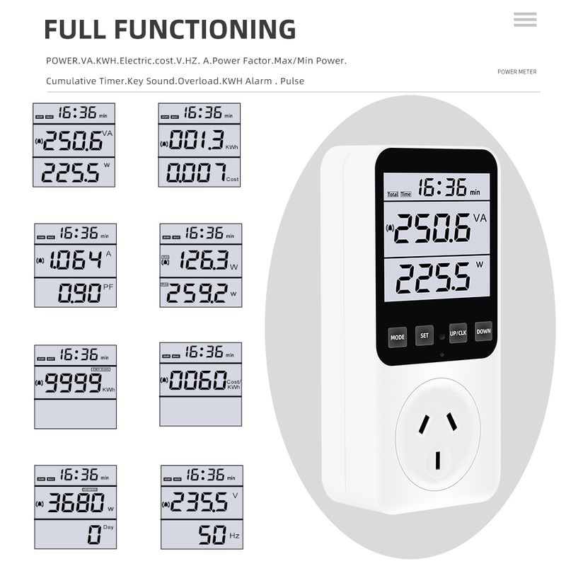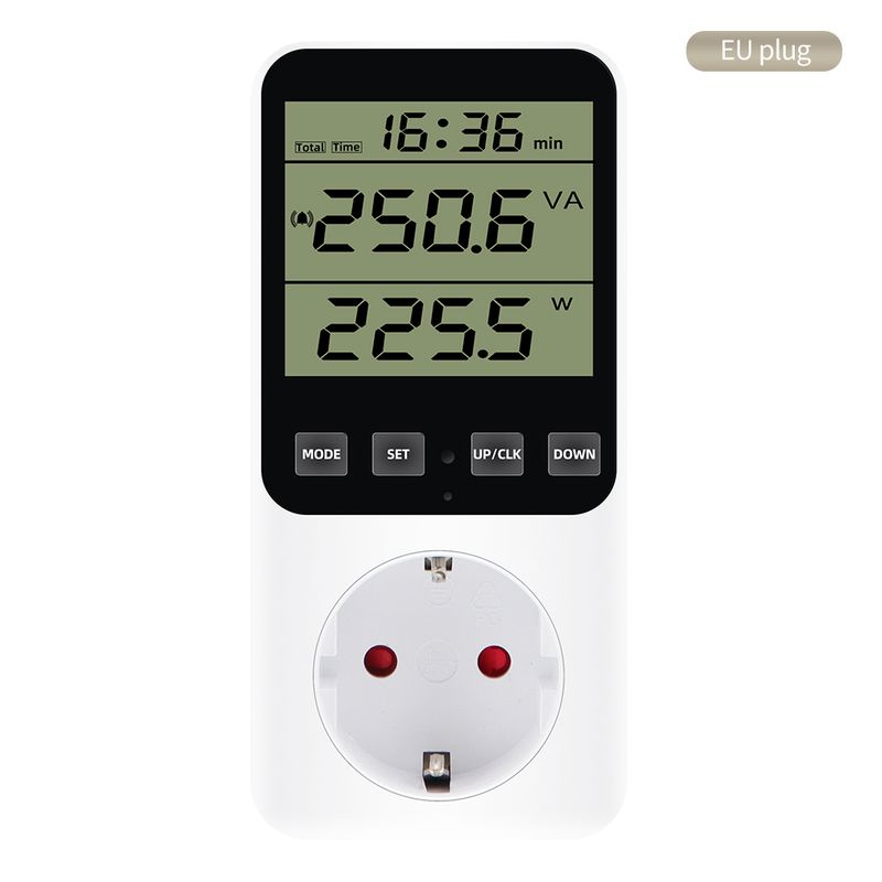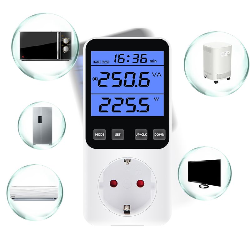 *14 measuring modes: measure power consumption (W), apparent power (VA), power consumption, power bill, voltage (V), frequency (Hz), amperage (A), power factor (PF), max/min power, cumulative time (kWh), key tone, overload alarm, power consumption alarm, pulse display and status of each power bill. (Does not count in standby mode) A perfect helper for home to save electricity and money.