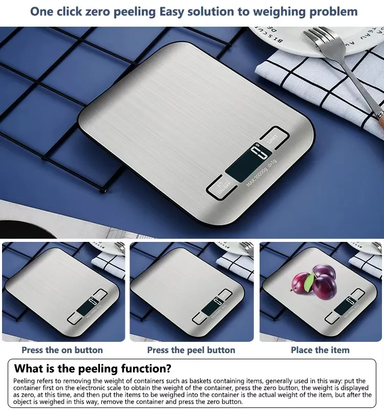 3.Easy to Tare and Clean:The tare function allows you to zero out the weight of a container or packaging material so you get the net weight of the item.Place an empty container on the scale and press the Z/T (Zero/Tare) button. The scale is equipped with a waterproof panel, smooth and easy to clean, you can easily wipe or rinse any spills and food residues.