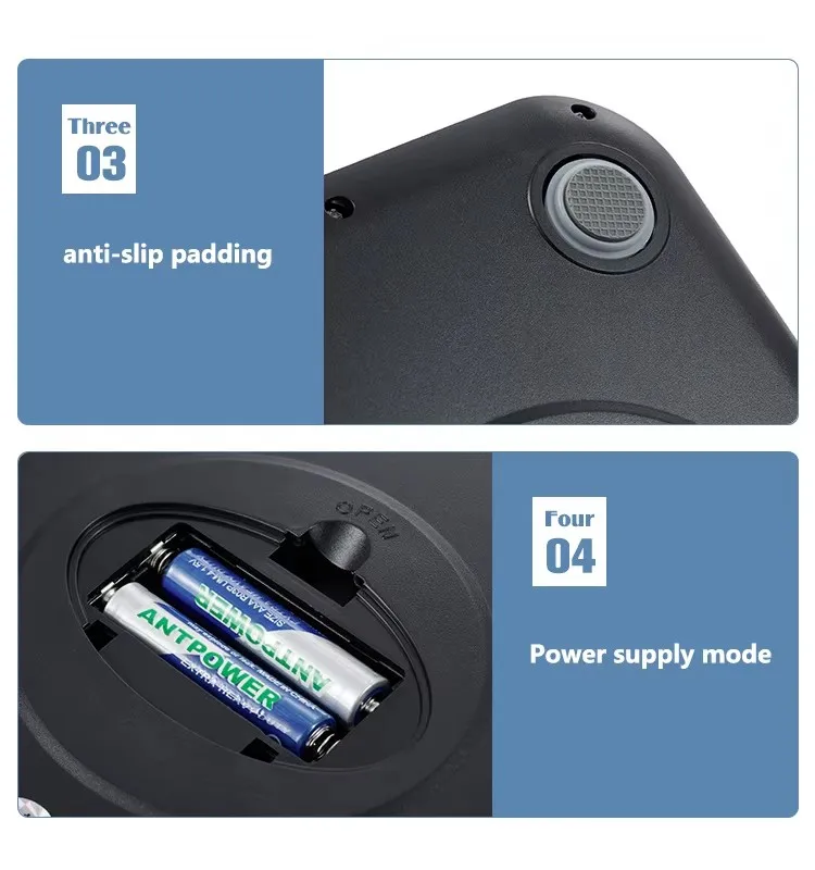 Description Features: Equipped with a high precision strain gauge sensor Large LCD and excellent load cell Auto zero resetting/power off Mode function (g/oz/lb/kg) 1.5v×2AA Battery ( not included) Over-load/Low battery indicator Auto off in 60seconds without operation Safety material (pp for foods)