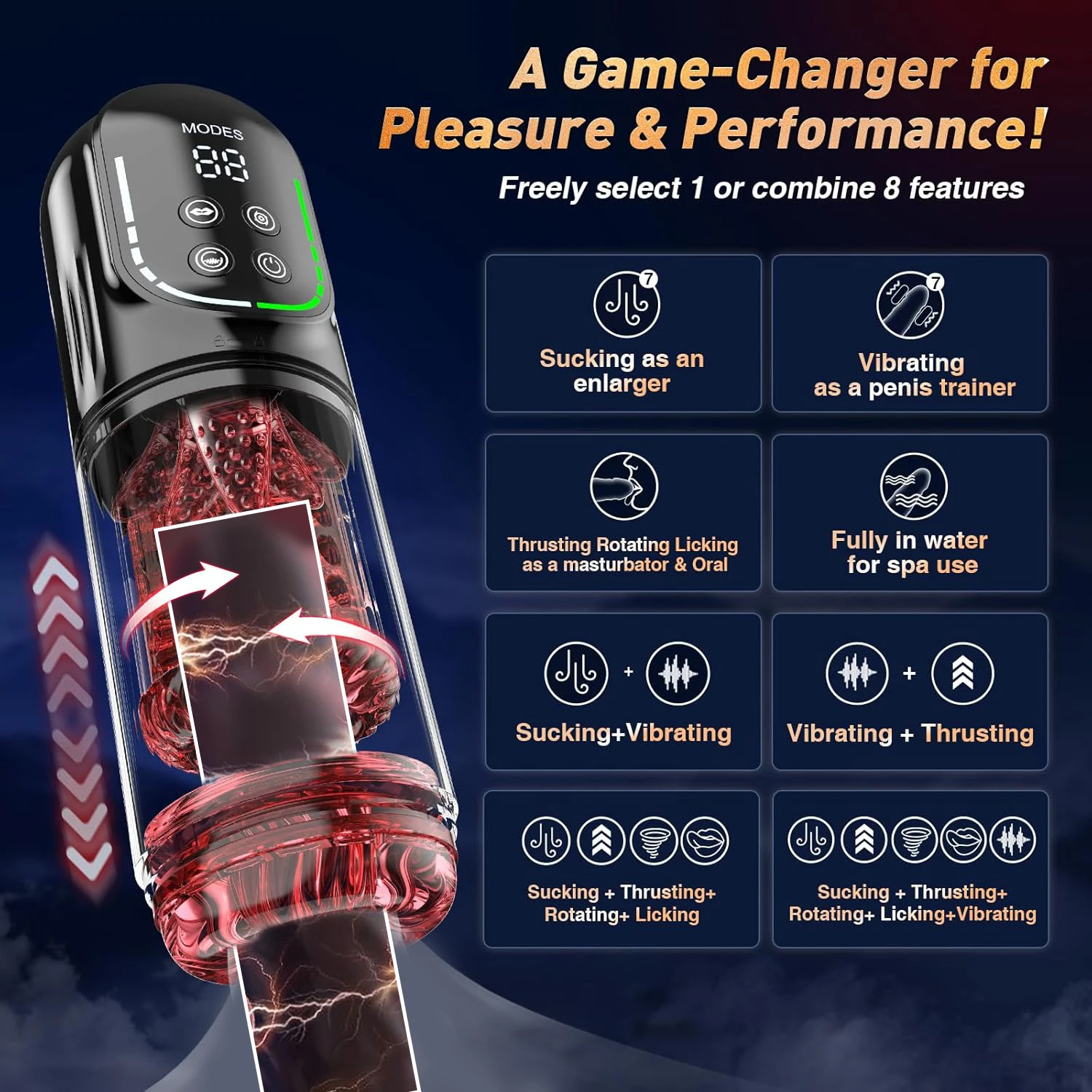 🍑A Game-Changer for Pleasure and Performance: You can freely combine these 8 functions on the Male Masturbator; 7 thrusting + 7 rotating + 7 sucking +7 licking + 7 vibrating + sex toys - pumps & enlargers + penis training + fully waterproof water spa ; Unlike traditional male sex toys for men just simple thrusting or sucking, Our sex toys - machines & devices combine 8 in 1, made things extra interesting!