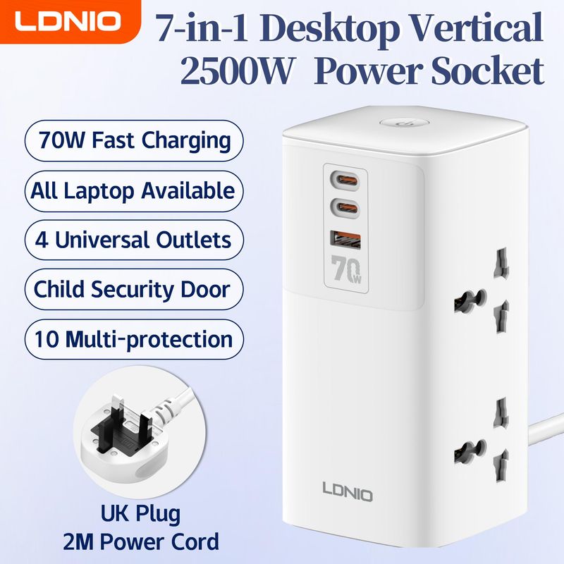 LDNIO Vertical Universal Socket Tower Power Strip Multi Outlets with 45W PD USB C Fast Charging Stations Extension Cable LED