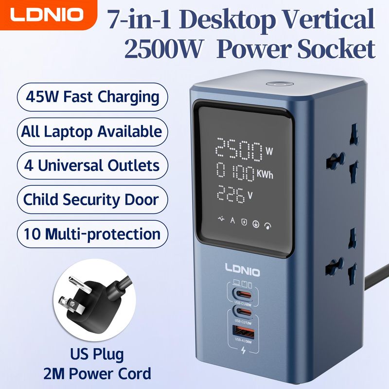 LDNIO Vertical Universal Socket Tower Power Strip Multi Outlets with 45W PD USB C Fast Charging Stations Extension Cable LED