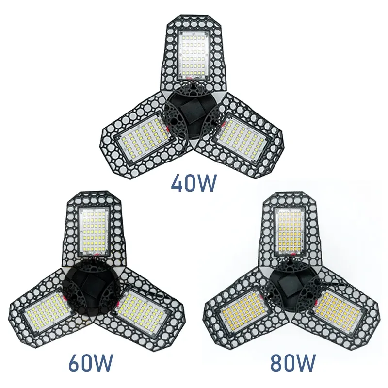 - Deformable Ceiling Light - LED garage lighting with a unique adjustable wide-angle design, each wing 90 degree adjustable, which can have a perfect garage lighting distribution curve according to your application, this will make the light cover 360°area. Just Perfect for garage, workshop, warehouse, basement, auto shops,carports office,shopping mail, workshop, anywhere need bright light.