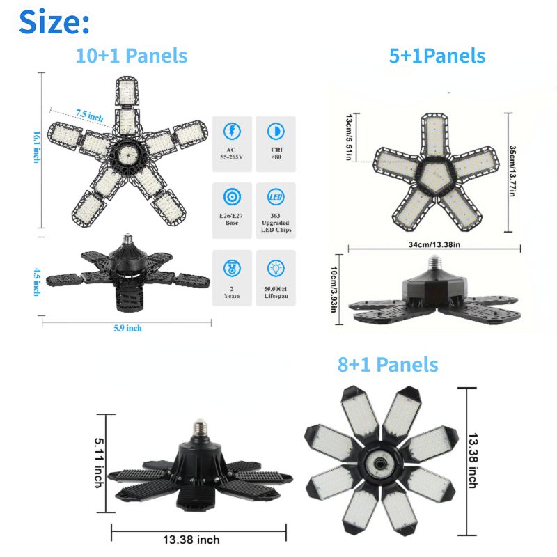 LED Garage Light with 5/8/10 Adjustable Panels Super Bright E27/E26 Ceiling Lighting Work Light for Basement Workshop Warehouse
