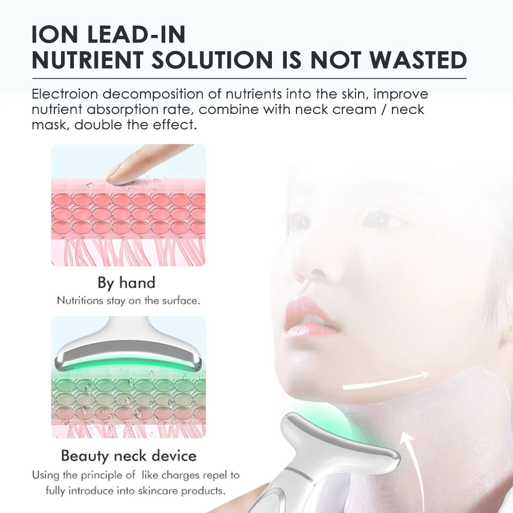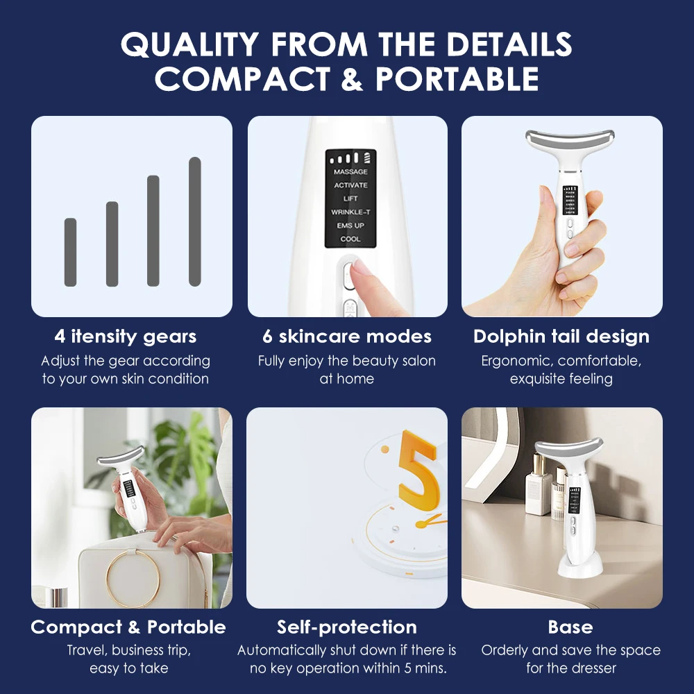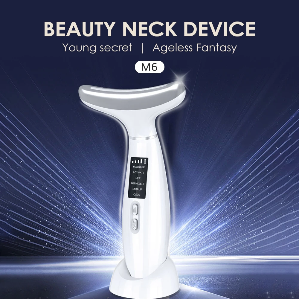 This neck beauty instrument integrates EMS micro-current positive ions +EMS micro-current negative ions+vibration+warmth+red+green+orange+blue four-color light+ice compress.Promote blood circulation together, stimulate acupuncture points on the face, neck and shoulders, dredge meridians, promote the discharge of long-accumulated waste, and slow down epidermal cells.