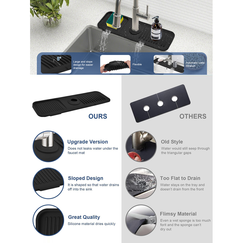 【EASY TO USE】Our silicone sink mat for faucet is made from 100% silicone, soft and reliable, reusable and durable, won't scratch your utensils, totally safe to use. Our silicone water catchers will catch the water and the water will drain to your sink, so don't worry about the wet fabric mat, or wash the faucet mat and dry it.