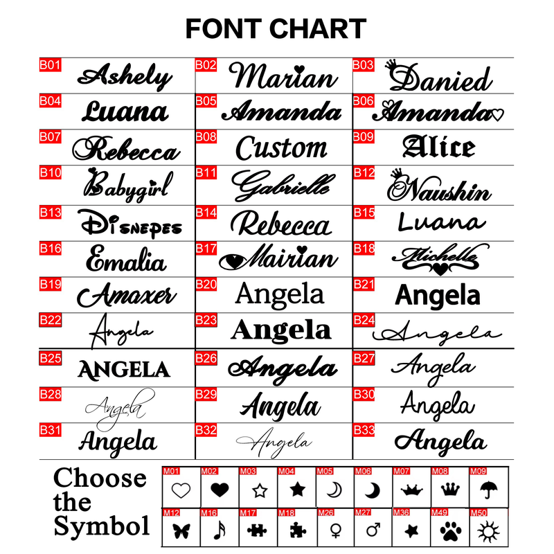 Note: Please write your preferred name or symbol from left to right. Pls send us the font,if no reply,default font B01 will be used