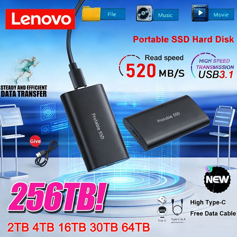 Lenovo 256TB External Hard Disk Portable SSD 2TB High Speed Solid State Drive USB 3.1/Type-C Mass Storage Device for Laptop/MAC