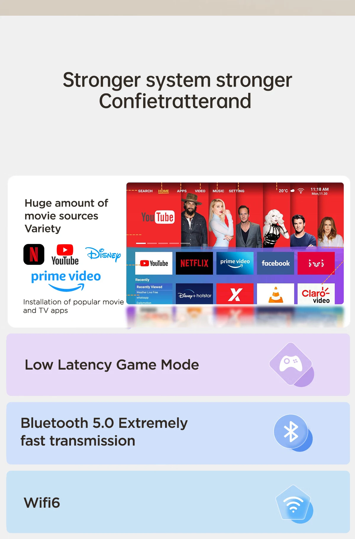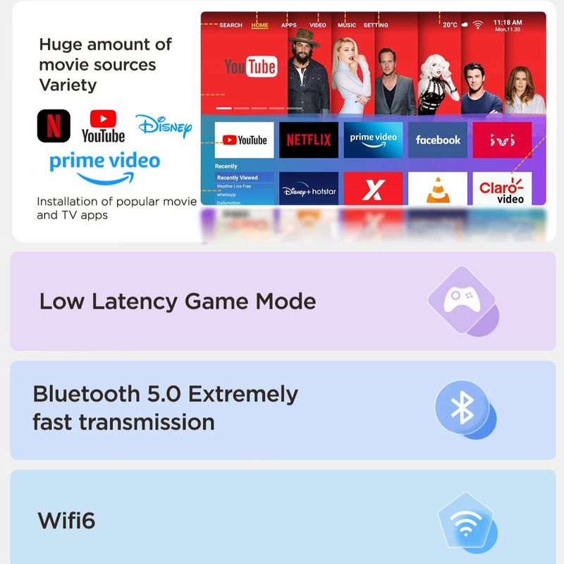 • Wireless casting & pre-installed Netflix/YouTube and so on