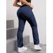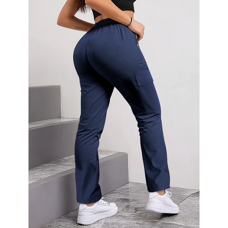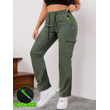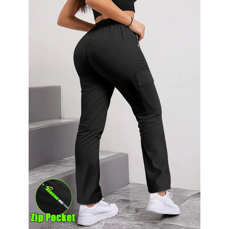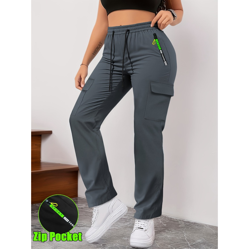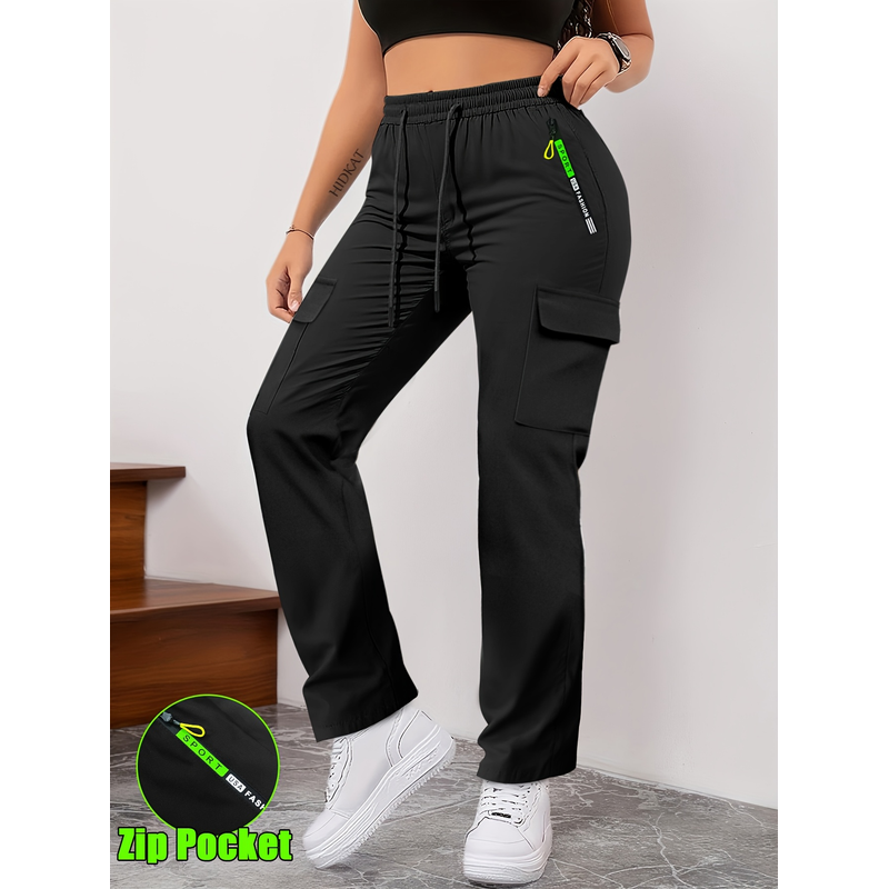 [Letter Print Cargo Pants] Fashionable Women's Cargo Pants Letter Print Patch Design Drawstring Elastic Waist, Zipper Pockets