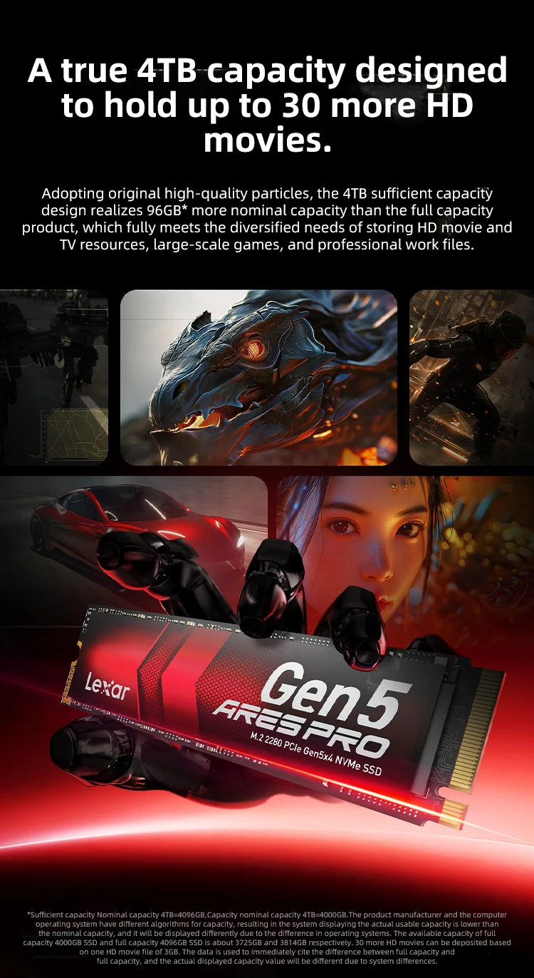 ● Adopting original high-quality particles, the 4TB full capacity design realizes 96GB more nominal capacity than the full capacity product*, which fully meets the diversified needs of storing HD movie and TV resources, large-scale games, professional work files, and so on.