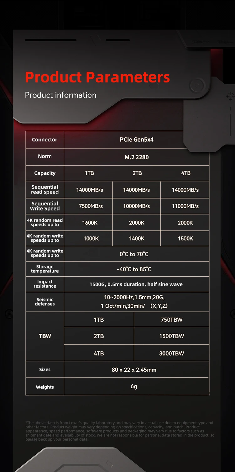 Random reads and writes up to 2,000K/1,400K IOPS1 1TB: Sequential write speeds up to 7,500MB/s Random reads and writes up to 16,000K/1,400K IOPS1 1400K IOPS1