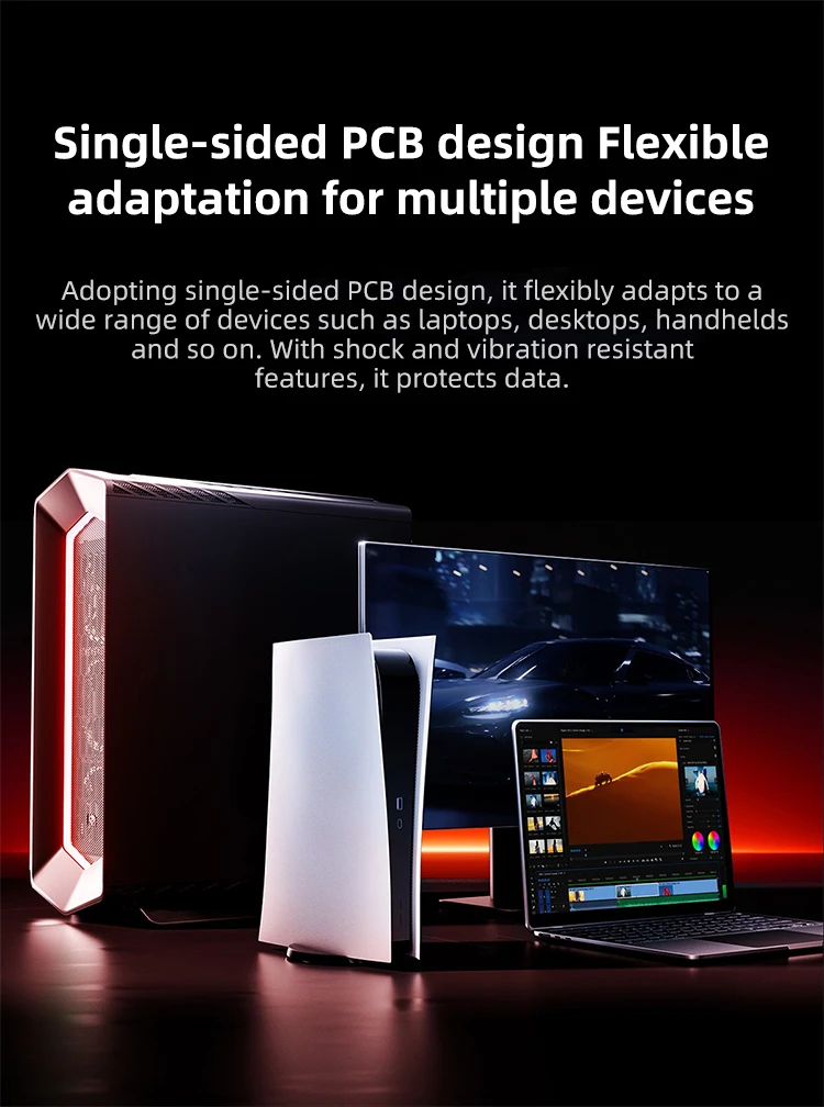 ● Adopting single-sided PCB design, it flexibly adapts to a wide range of devices such as laptops, desktops, and handhelds. With anti-shock and anti-vibration features, it protects your data.