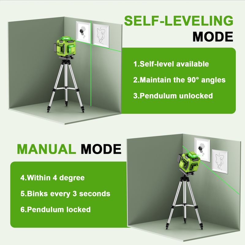 Our laser level boasts advanced features such as a self-leveling function, multiple mounting options, and a long-distance projection range, making it an essential tool for any project.this laser level ensures that your lines are perfectly straight and level. No more wasting time on manual adjustments or using bubble levels. Simply set up the laser level, and it will automatically adjust to provide accurate measurements.