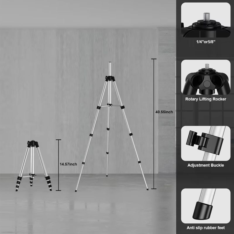 The Tripod can expand to 37-1/2 inch, helping you adjust the position of the laser for maximum accuracy. It has a closed height of 17 inches, ease of storage; Equipped with a magnetic bracket, the laser tool can be rotated at 360° randomly. The magnetic bracket offers 1/4"-20 mount threads to suit tripod.