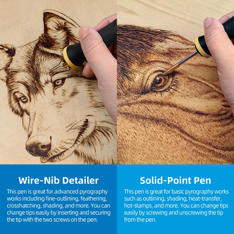 • DIGITAL ADJUSTABLE TEMPERATURE WOOD BURNING AND IRONING MACHINE: The wood burning kit is suitable for 120V voltage,The highest temperature can reach 750.It is a wood burning tool with temperature digital display function, which can accurately control temperature and finely depict the picture. There are two different types of firewood burning pens with different functional characteristics for drawing.The main advantage of metal wire pen tip is to depict lines, while theadvantage of solid copper pen tip is to render color depth and color blocks.