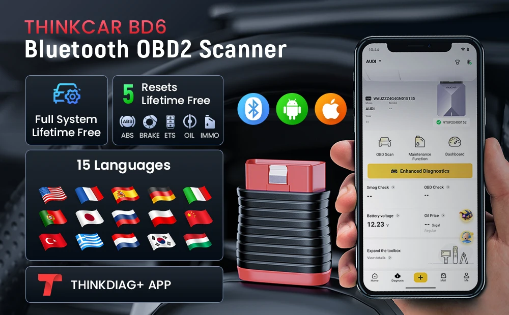 THINKCAR BD6 cost-effective Scanner for Car with Lifetime Update: Unlike Other BT Scanners in this Budget, THINKCAR BD6 OBD2 scanner diagnostic tool without the hidden costs, Equipped with All Systems diagnosis, 5 common maintenance function, Auto VIN, History VIN,I/M Readiness, ensuring everything for comprehensive vehicle diagnostics for Car Owners, DIYers, car hobbists, home mechanics.