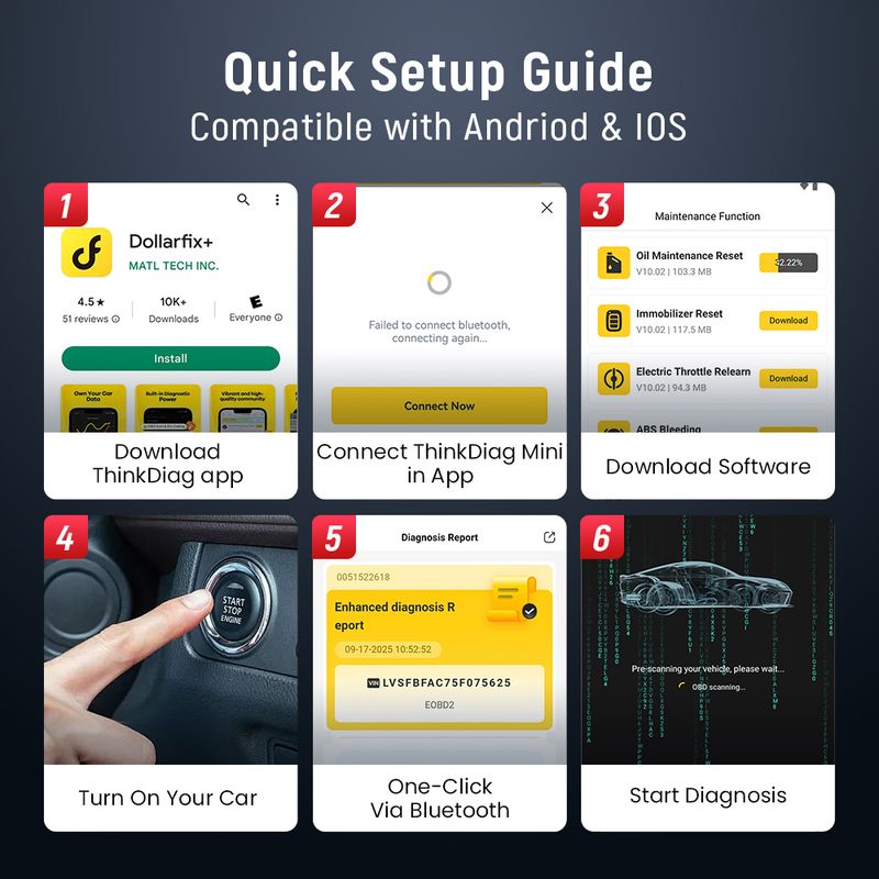 🏆Quick BT Connect for iOS & Android: Transform your devices into a professional vehicle diagnostic tool with the OBDⅡ scanner. Fit for iOS and Android devices, it's as easy as opening the app and tapping the one-click connect button! For optimal BT connectivity, always pair through the app instead of using phone settings, and stay within 33 feet of the scanner. Note: Please Update the VCI before use. Keep your phone close to the scanner and BT connected during the update.