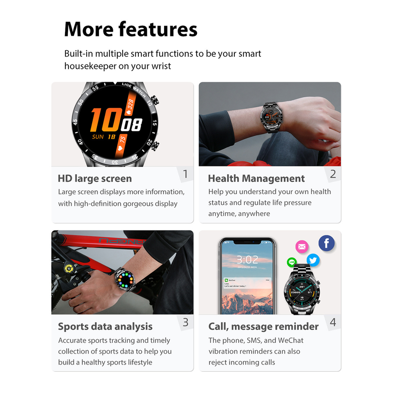 Additional features: step counting, remote control selfie, health monitoring, information push, sleep analysis