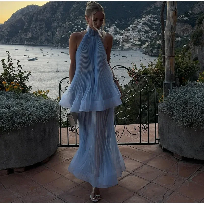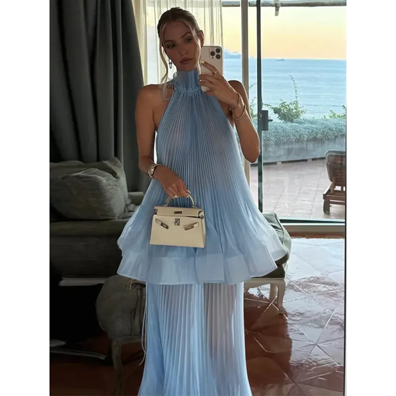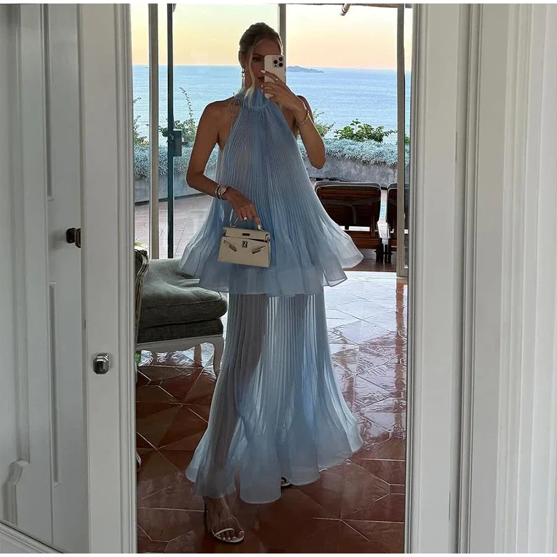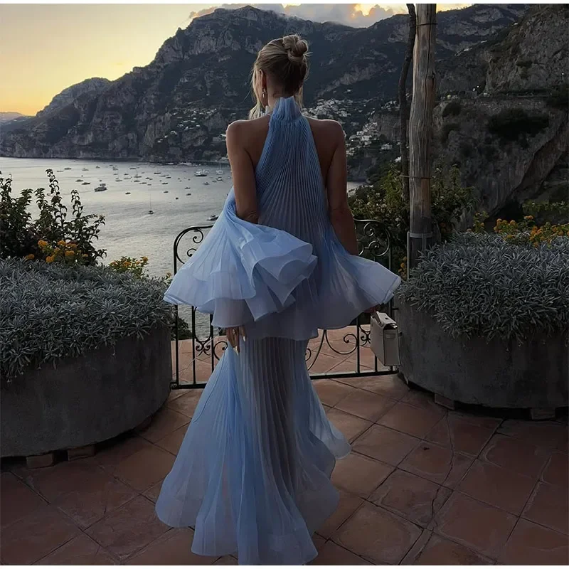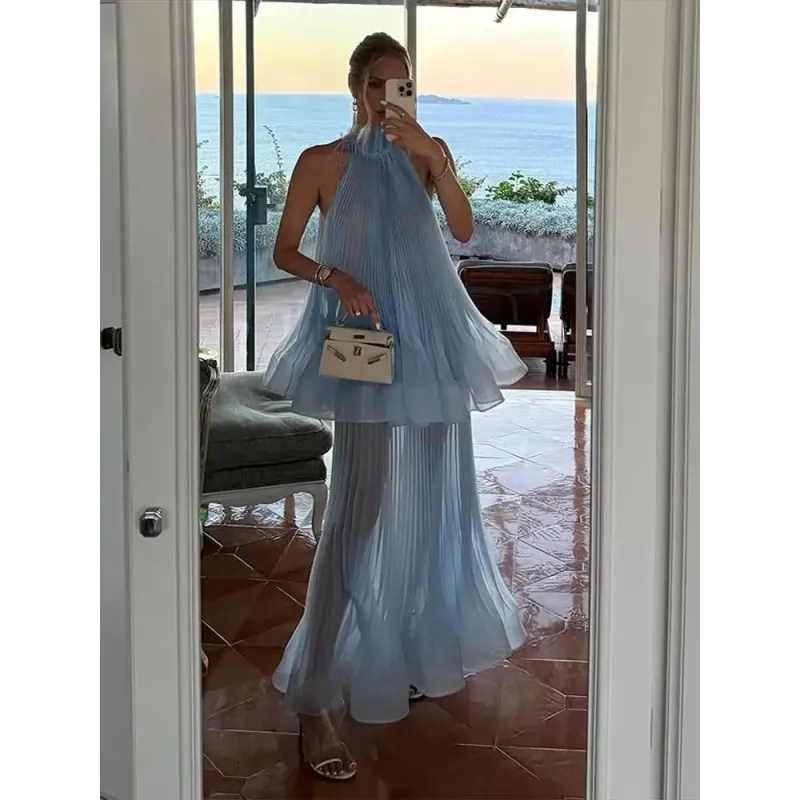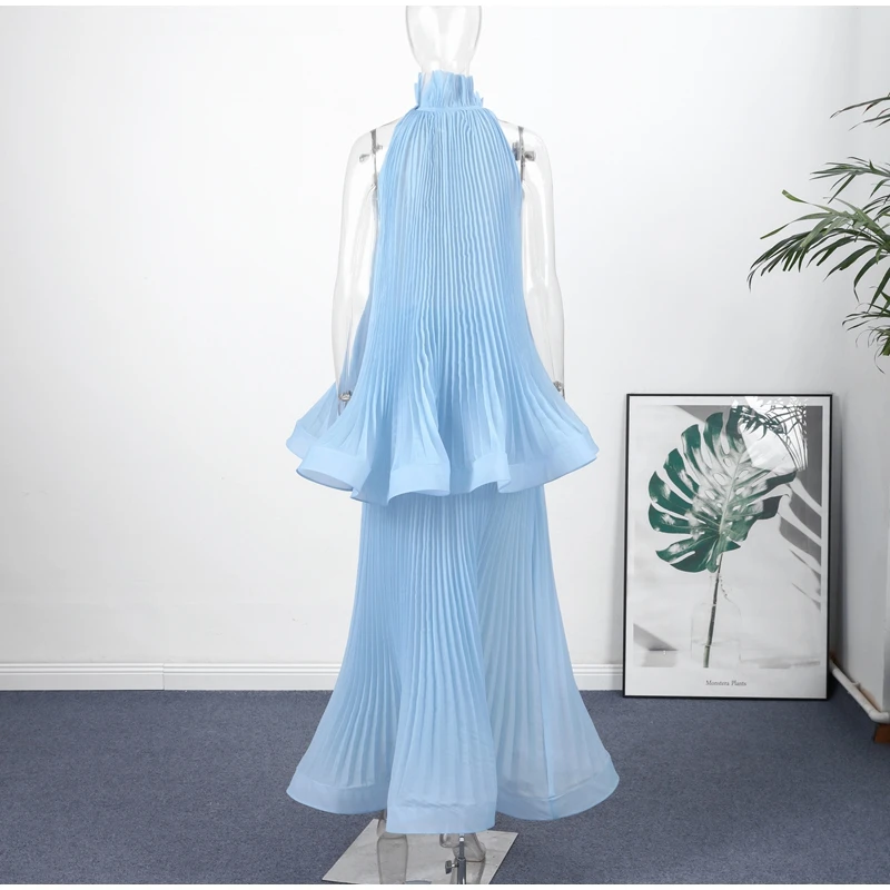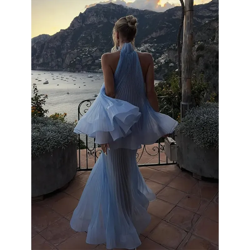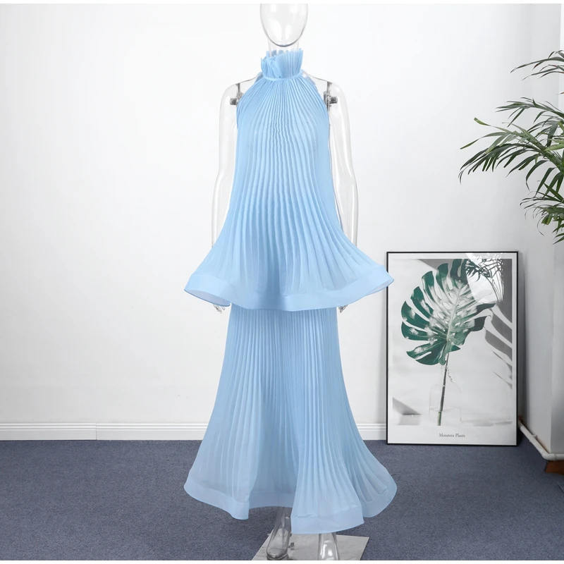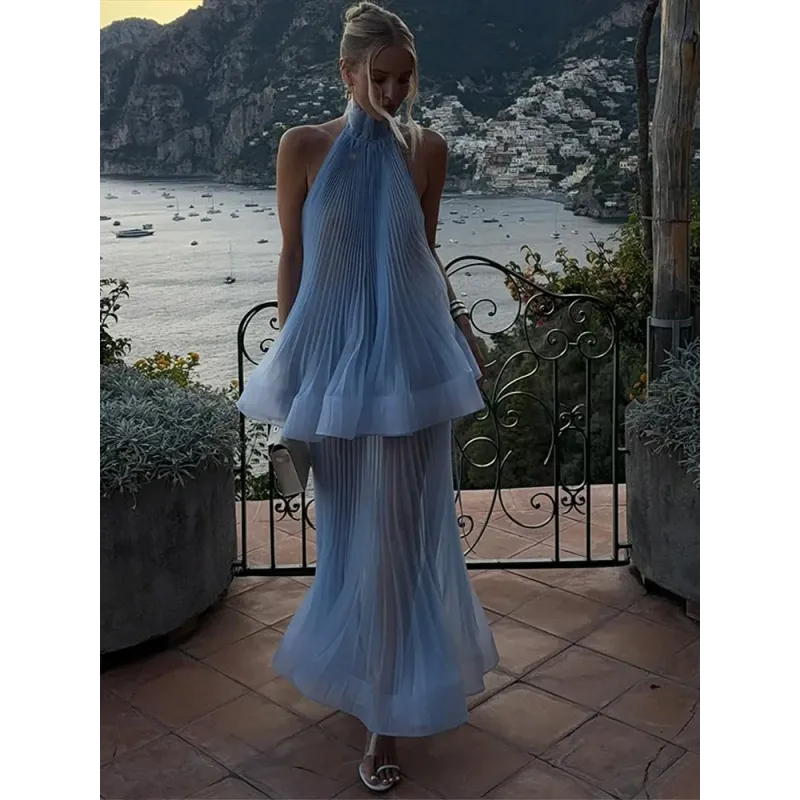 This Light Blue Halter Neck Pleated Two Piece Set features a chic halter neck design and a ruffled top, perfect for elegant evening parties.