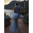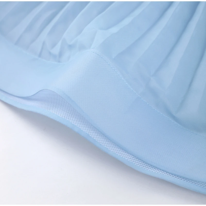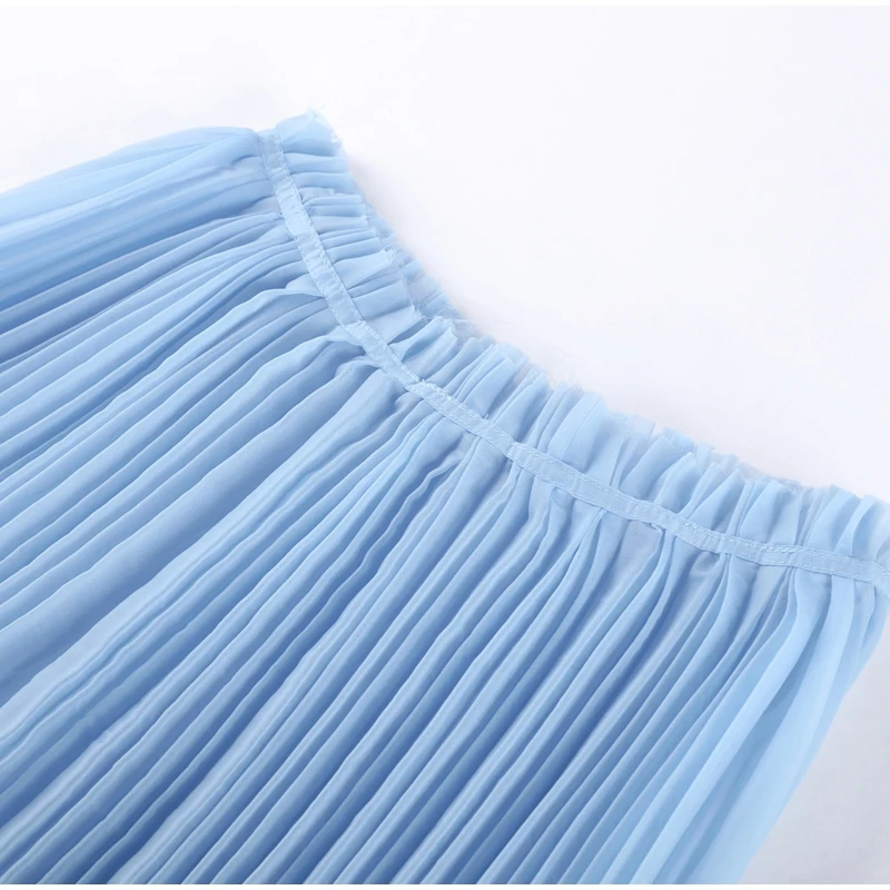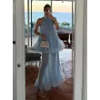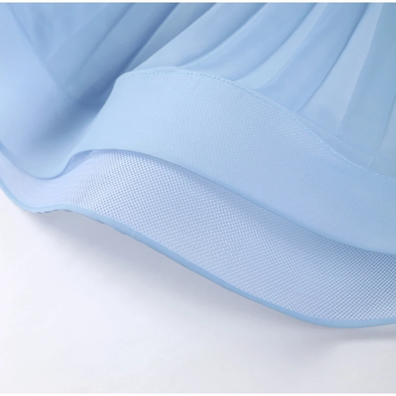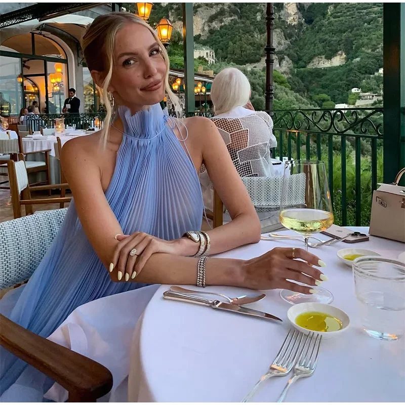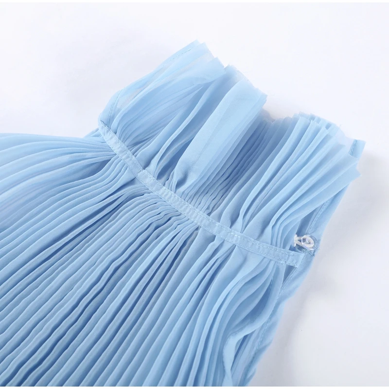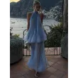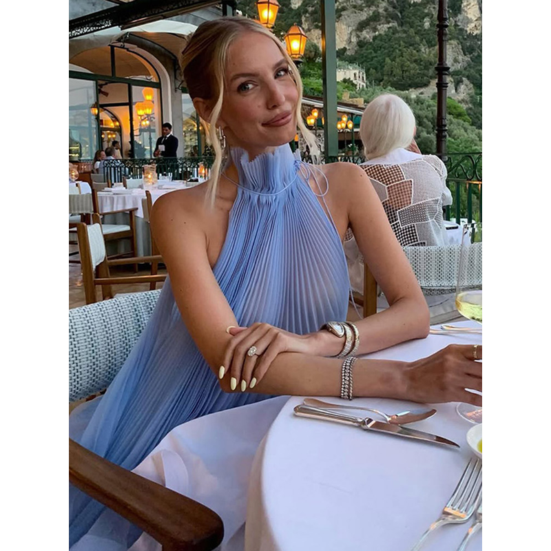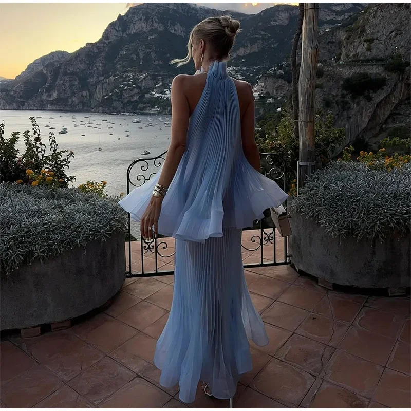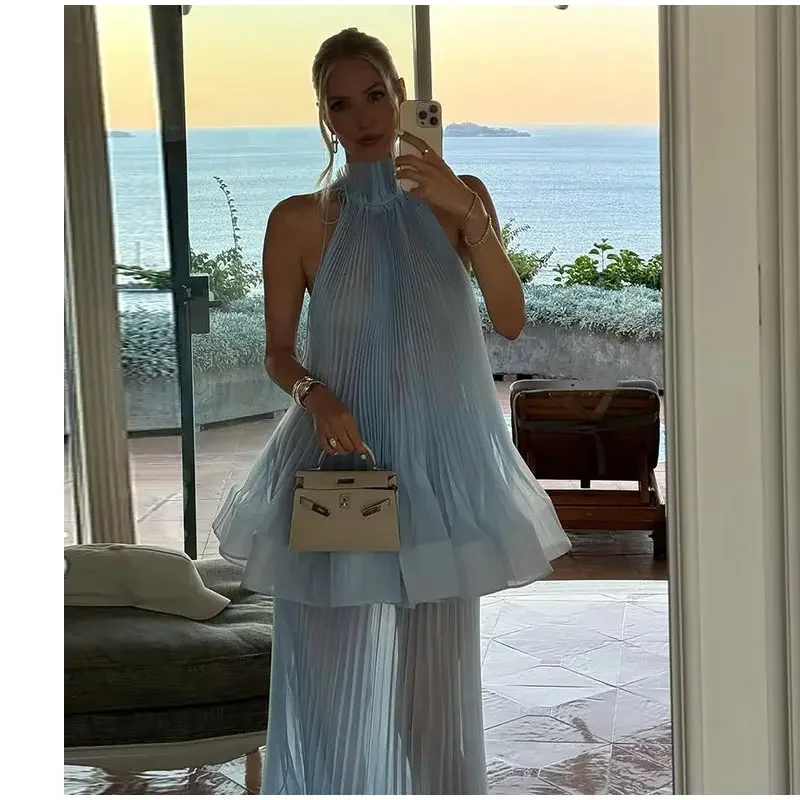 This Light Blue Halter Neck Pleated Two Piece Set features a chic halter neck design and a ruffled top, perfect for elegant evening parties.