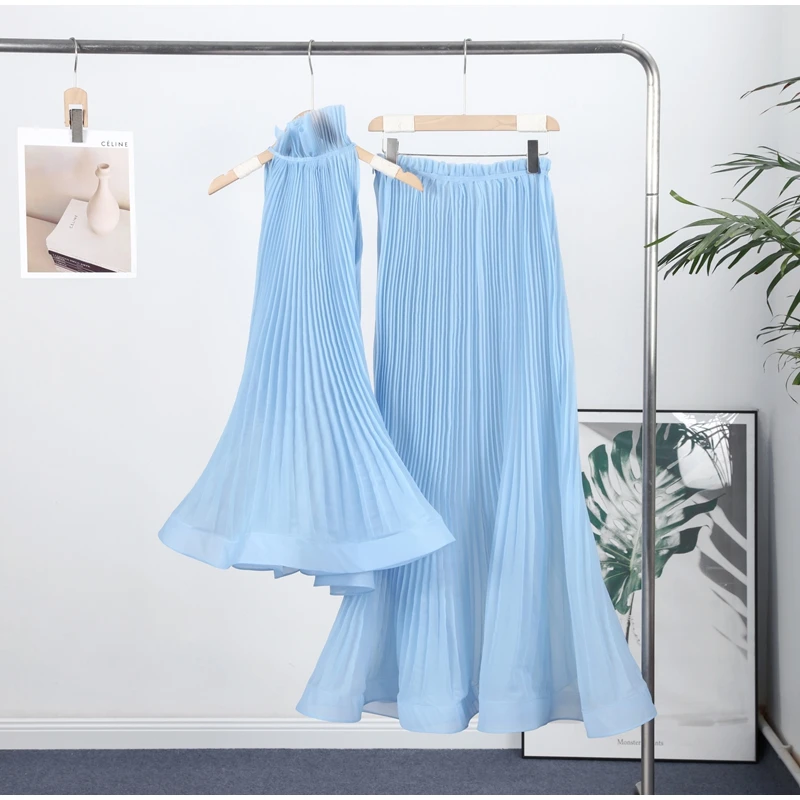 The set includes a chiffon top and a maxi skirt, both with elastic waist for easy wear and a flattering A-line silhouette.