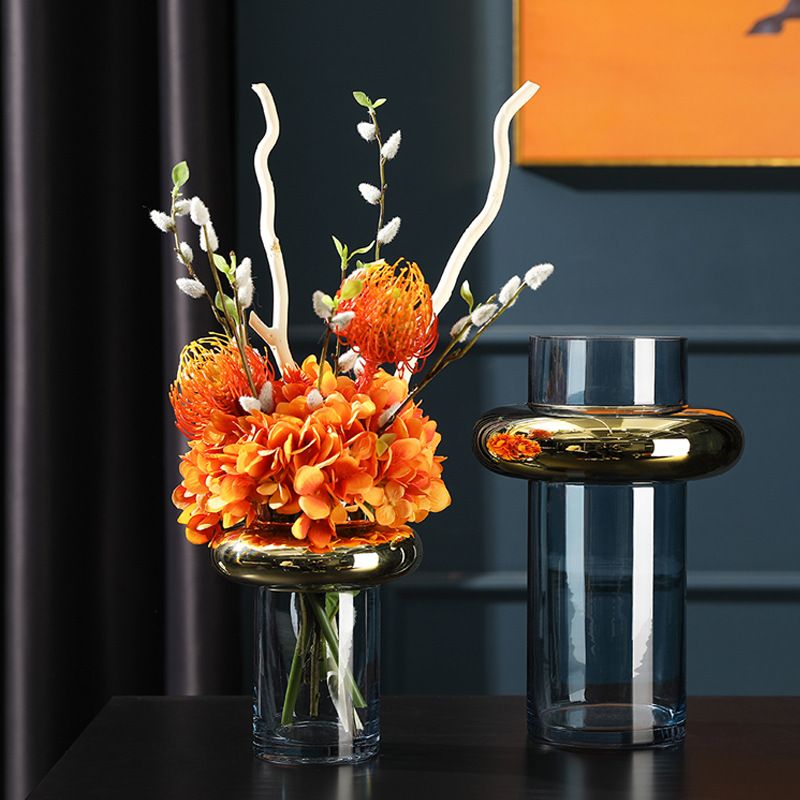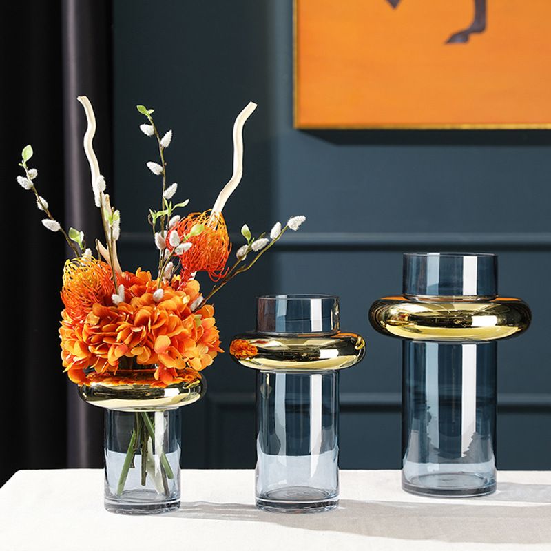 Light Luxury Grey Blue Transparent Glass Vase Model Room Gold Middle