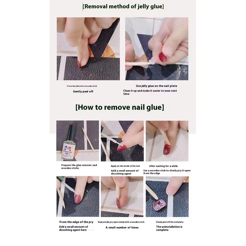 Nail enhancement sheet * 10+Jelly glue * 1+Glue * 1+Rubbing strip * 1+Alcohol cotton sheet * 1+Small wooden stick * 1
