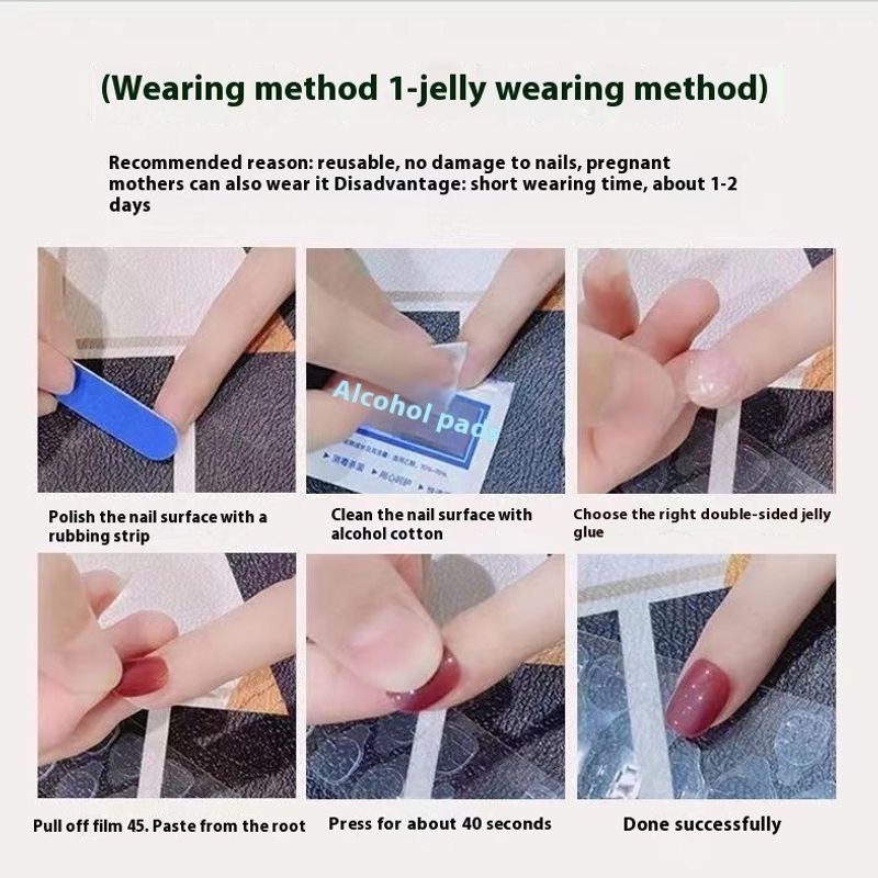 Nail enhancement sheet * 10+Jelly glue * 1+Glue * 1+Rubbing strip * 1+Alcohol cotton sheet * 1+Small wooden stick * 1