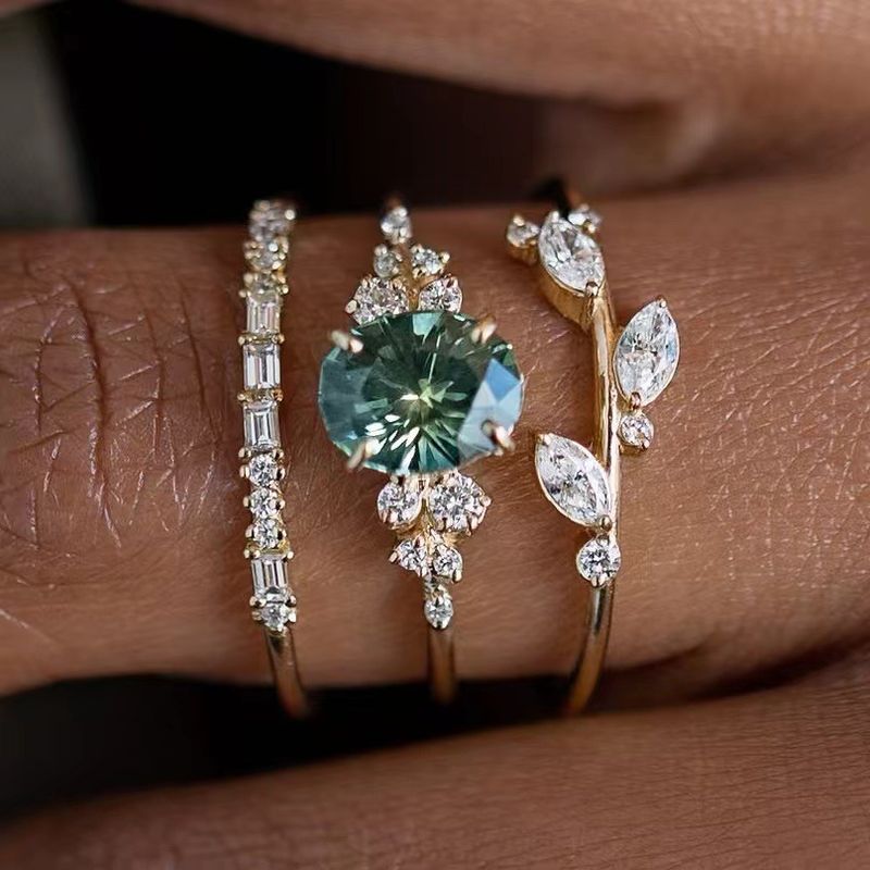 Light Luxury Temperament Flower Ring Three-piece Ring Set Green Diamond No 8