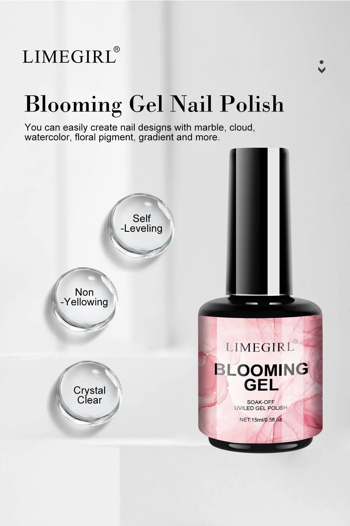 1.Use our Blooming Gel create nail designs such as marble, natural stone, watercolor, floral print, tie dye, gradients and more! Create fancy, interesting and elegant nail art in seconds.