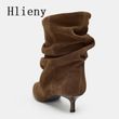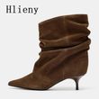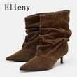 Liyke Winter Pleated Suede Women Shoes Pointed Toe Low Thin Heels Female Brown Retro Elegant Designer Ankle Boots Bottes Femme