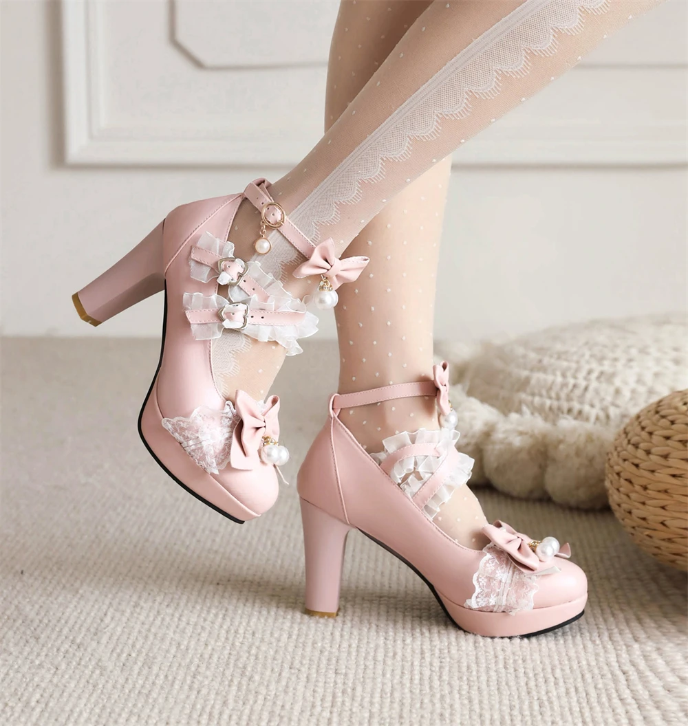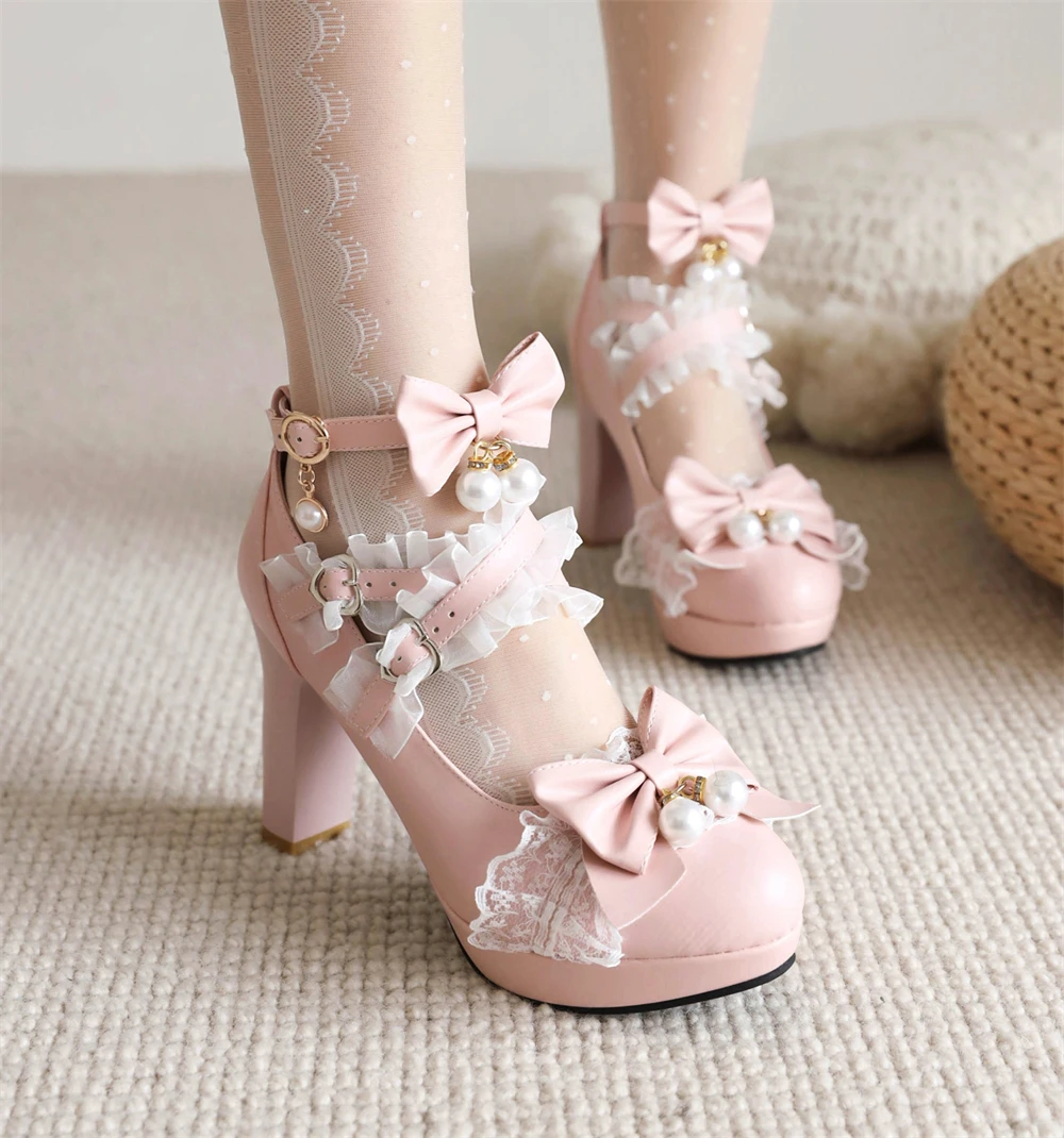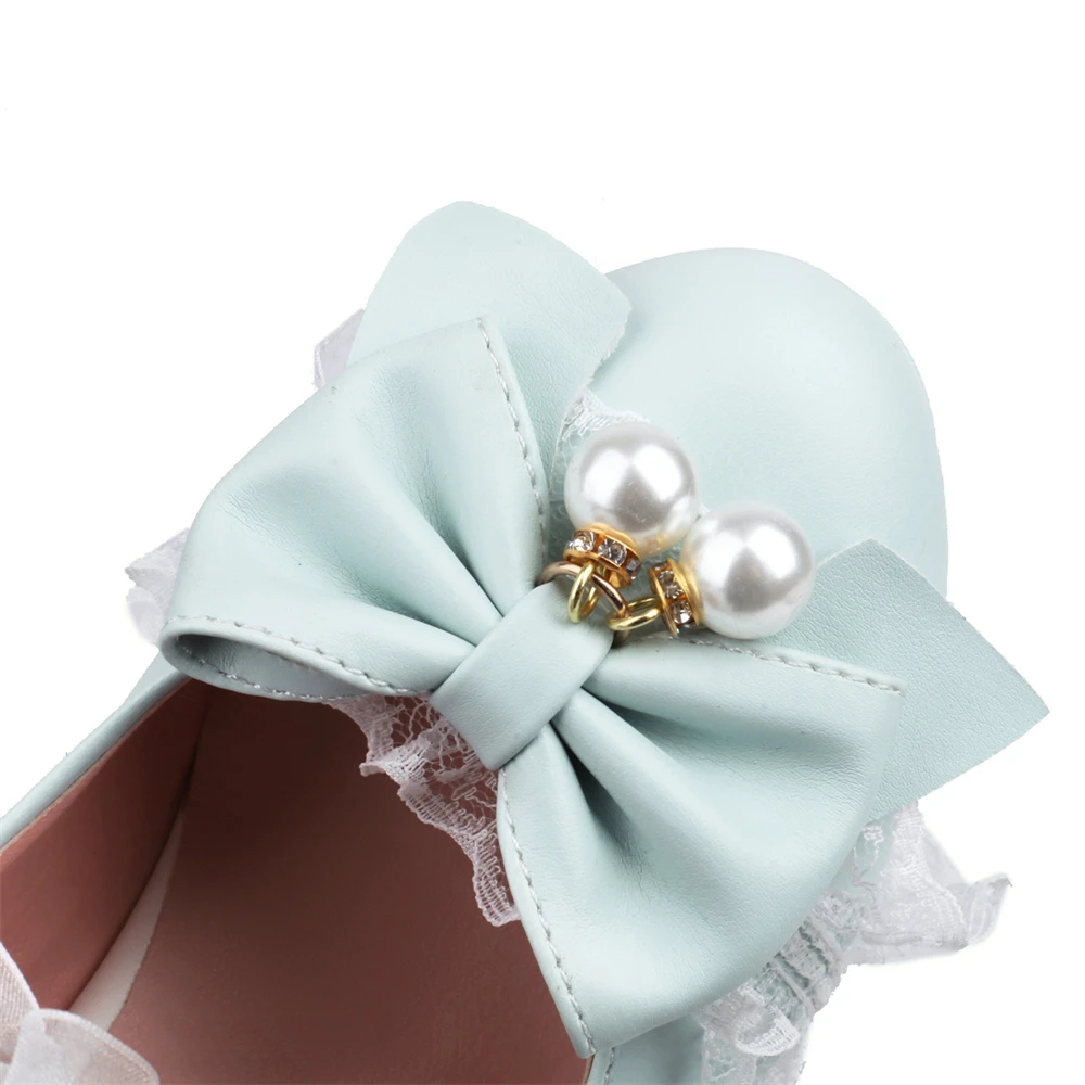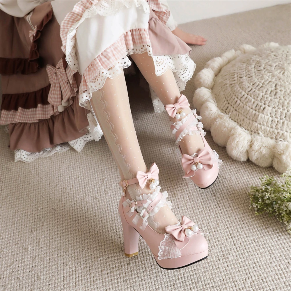 Lolita Japanese Pearl Bow Jk Sweet Cute Strap Super High Heeled Round Head Student Shoes Kawaii Girl Tea Party Cos Loli Vintage