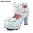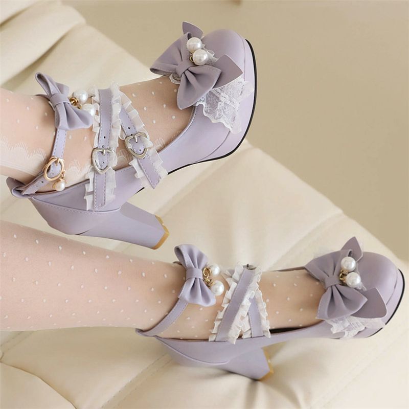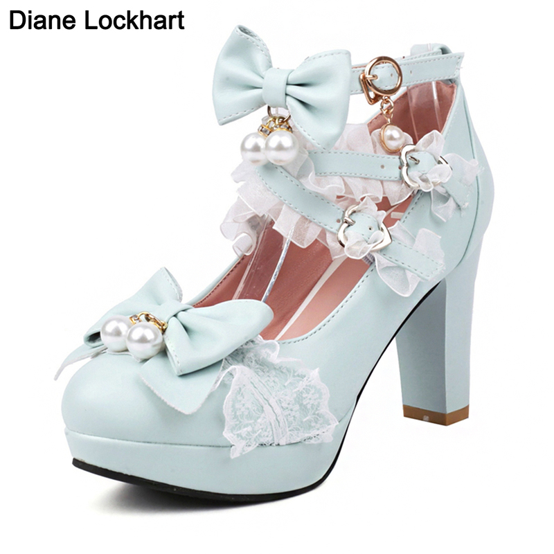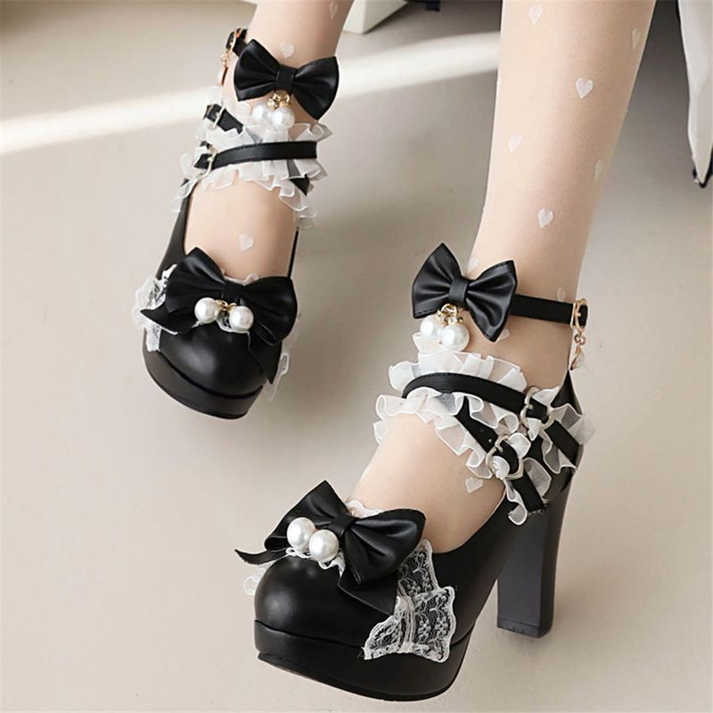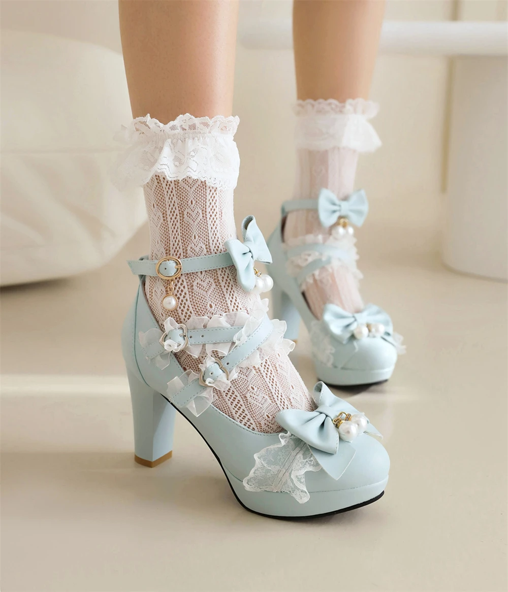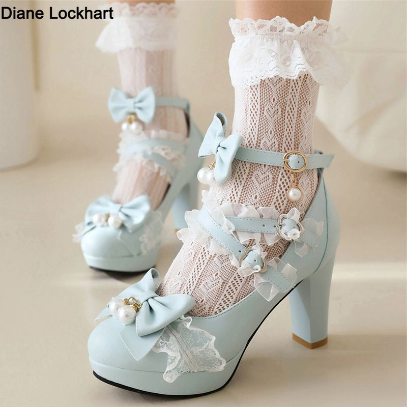 Lolita Japanese Pearl Bow Jk Sweet Cute Strap Super High Heeled Round Head Student Shoes Kawaii Girl Tea Party Cos Loli Vintage